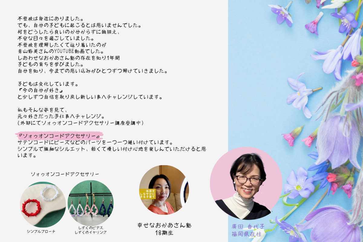 青山節美さんは、子育ての悩みを抱えるおかあさんたちへ改善に向かうヒントを日々発信し続けています。