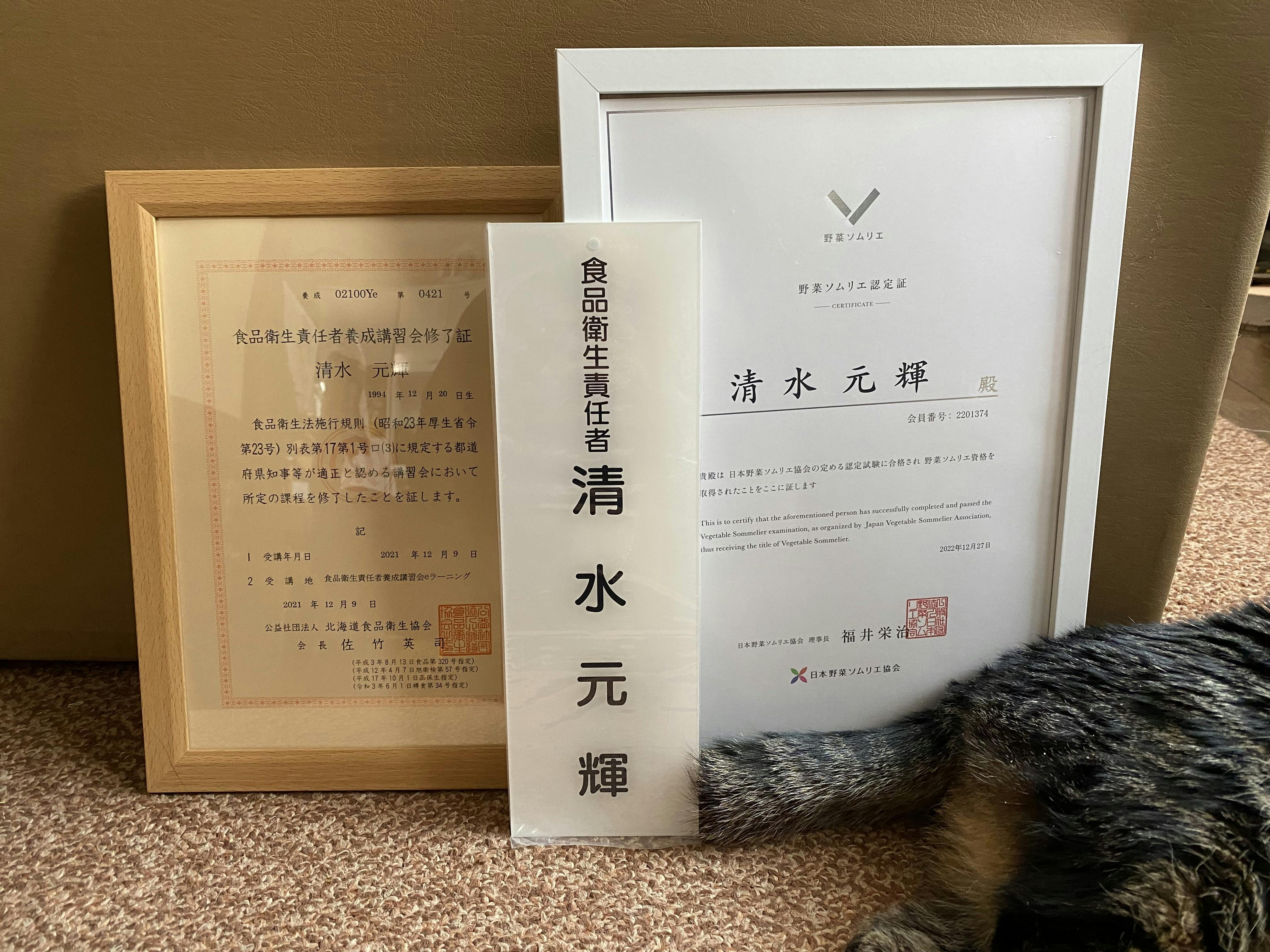 野菜のフードロス活動やイベントを通じて、お客様に野菜の事を尋ねられる事がおおくなったので、衛生面、安心面共に知識を身につけ、野菜ソムリエ資格・食品衛生責任者資格の取得!!