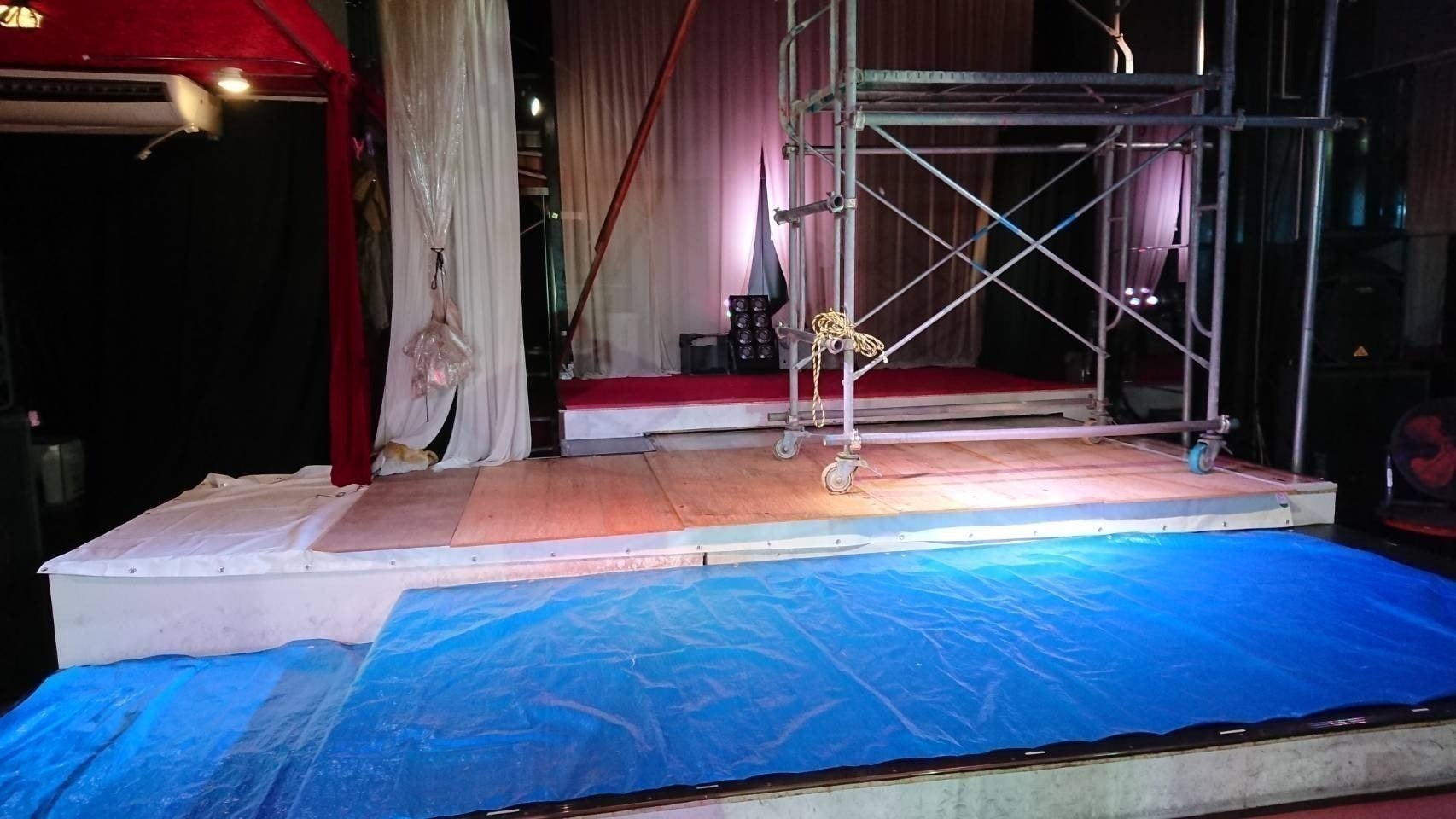ビルの汚水による漏水でステージが水浸しになり中断。照明機器など電化製品や衣装が汚水被害に遭ってしまいました。