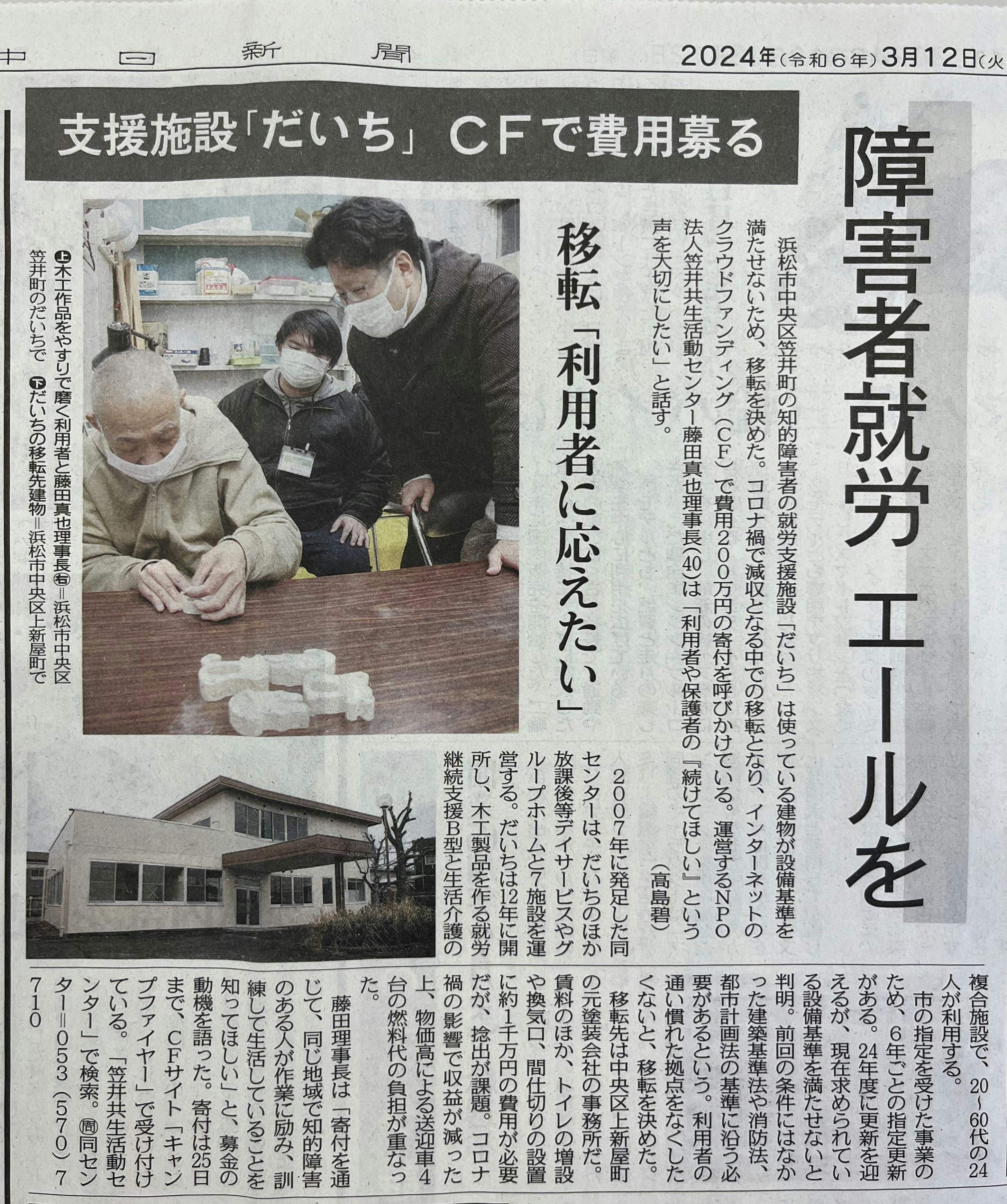 本日、3月12日の中日新聞に記事を掲載していただきました。