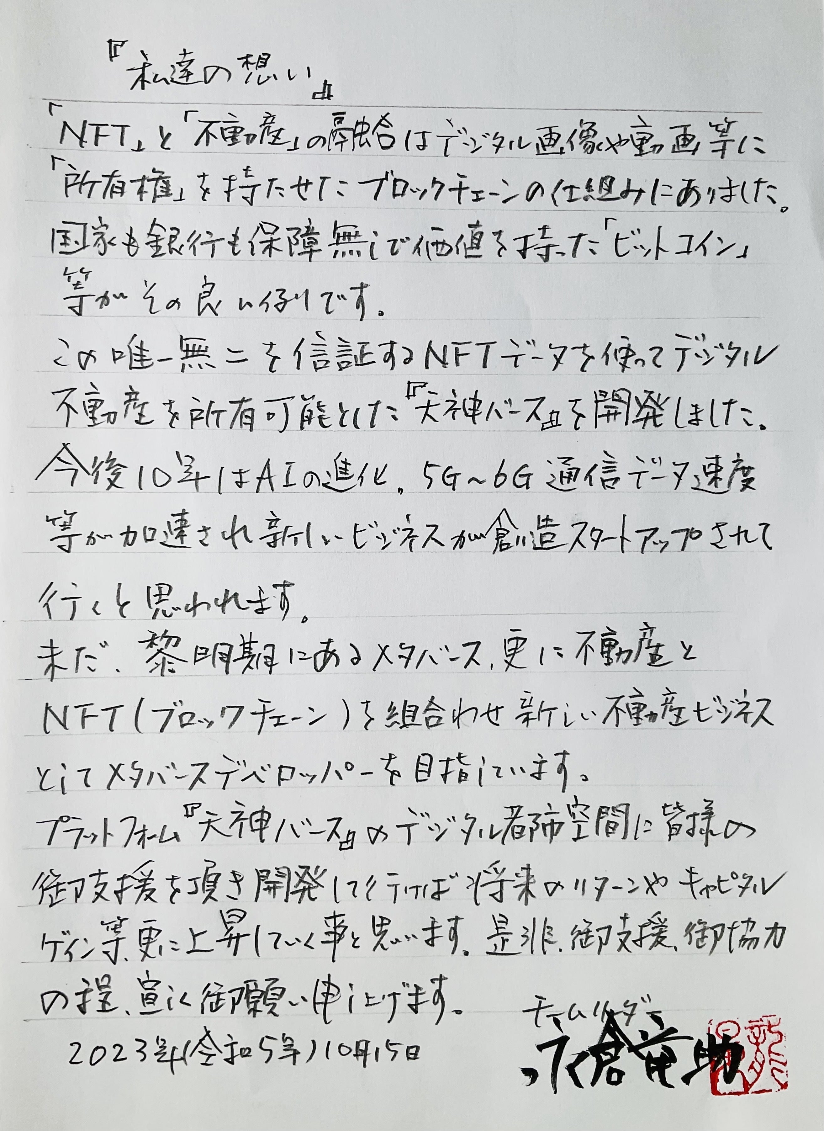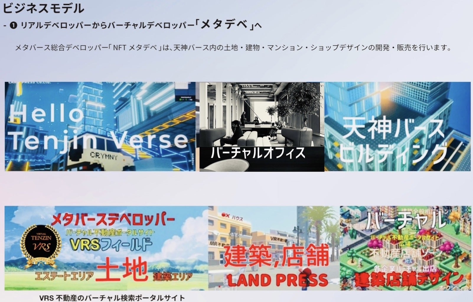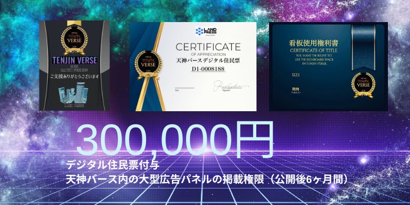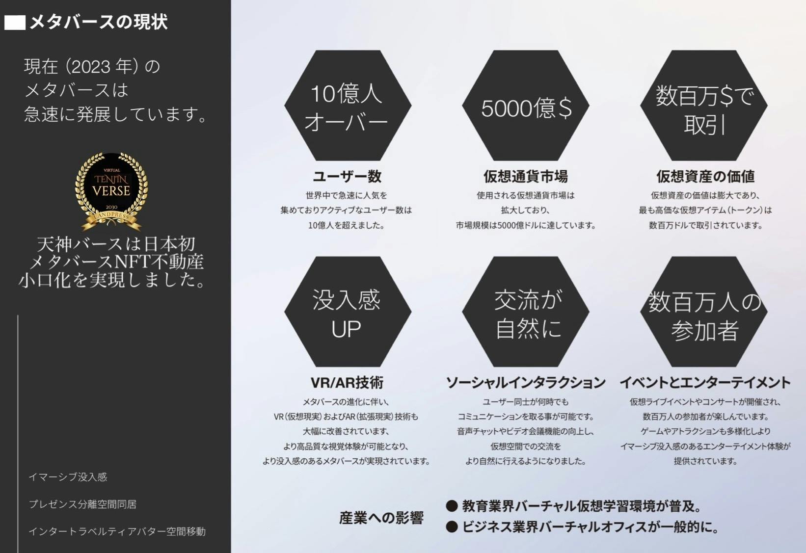 まだ黎明期にあるメタバース更に不動産とNFTを組合わせ新しい不動産ビジネスとしてメタバースデベロッパーを目指しています。プラットフォーム『天神バース』のデジタル都市空間に皆様の御支援を頂き開発して行けば将来のリターンやキャピスゲィン等、更に上昇していく事と思います。