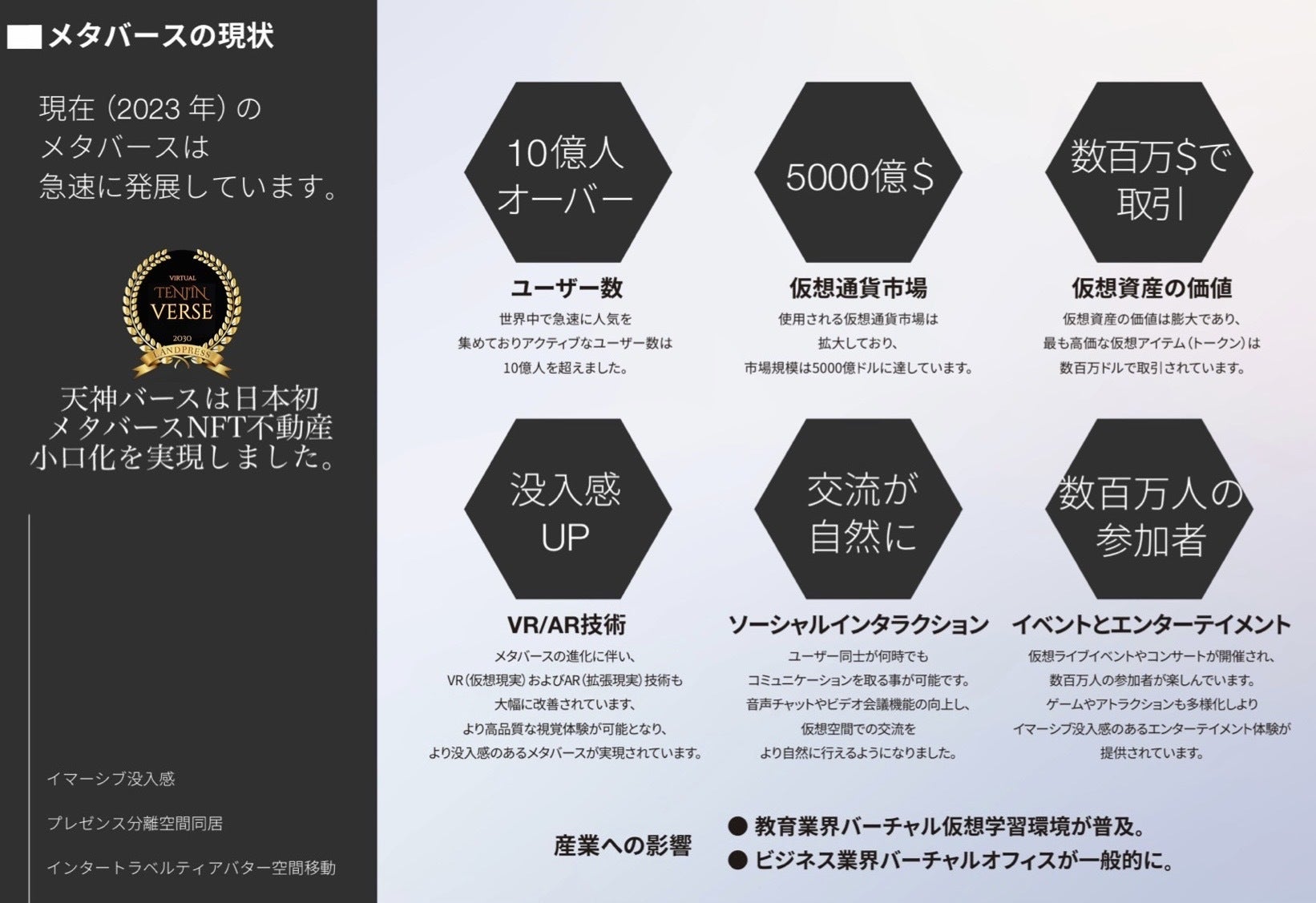 現在、私たちは福岡市行政、福岡商工会議所、企業等と協力し、メタバース仮想都市「天神バース」の価値を向上させ、福岡を活性化させる取り組みを行っています。これを通じて、不動産業界だけでなく、デジタル革新と革命的なアイデアによって、新しいビジネスモデルを形成し、より持続可能で魅力的な未来を築くお手伝いをしていきたいと考えています。