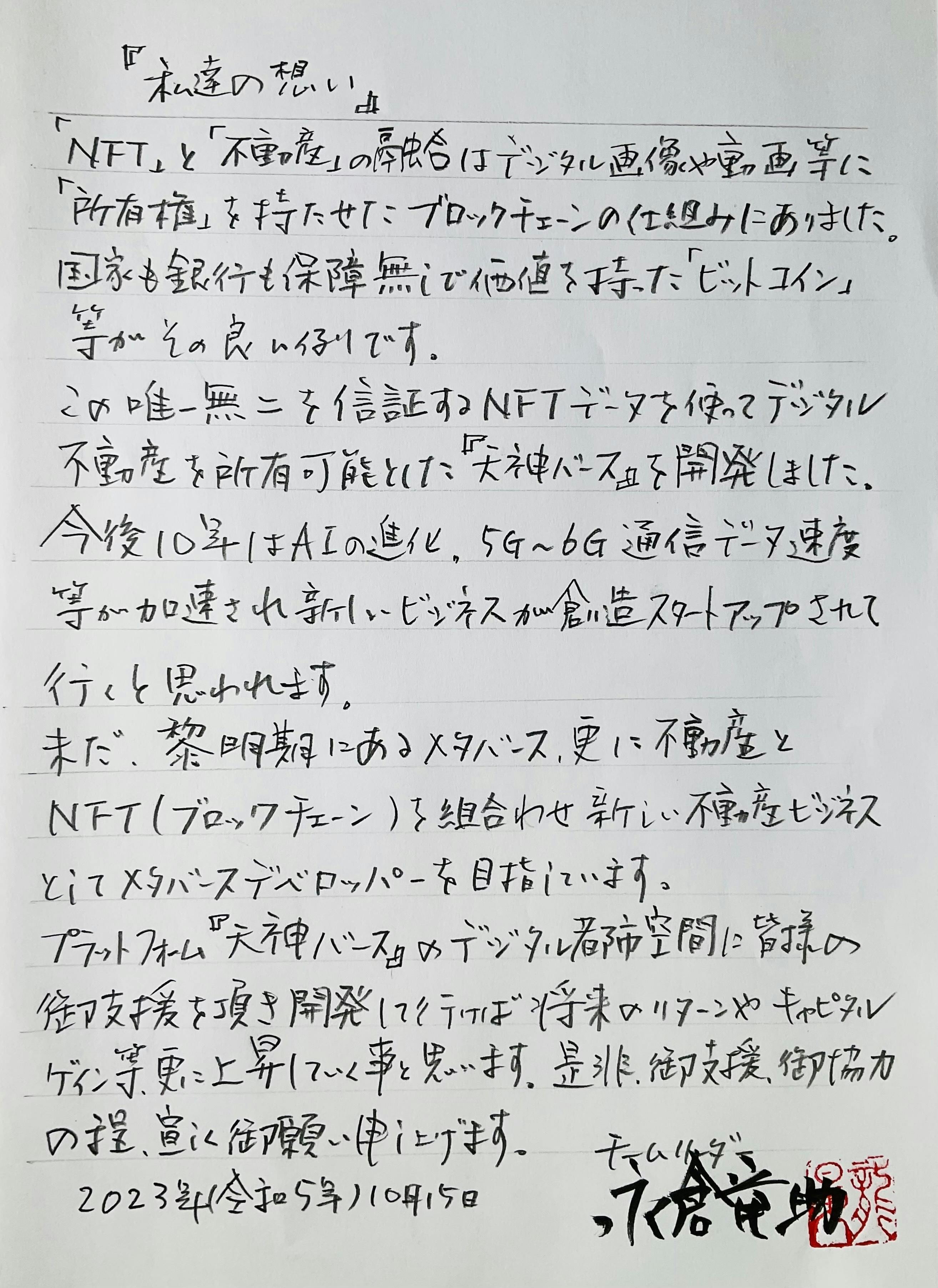 今回のプロジェクトでは、あまり馴染みのない、メタバースや、それにともなう天神バースの実際に出来る事がどんな世界なのか?等を動画にし、広く拡散して、支援者や仲間を集める事です!