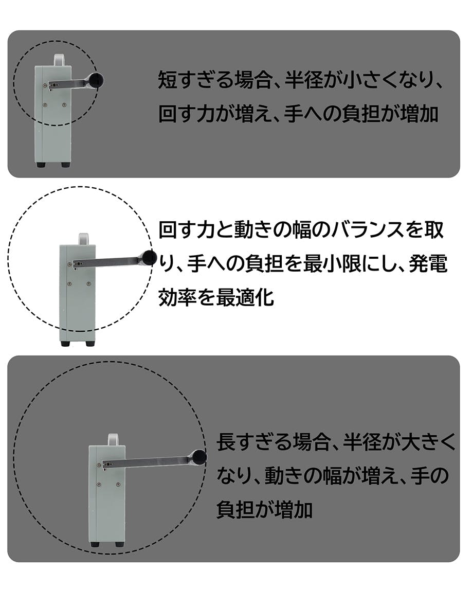 手回しのアームの長さによって回す時の手への負担と発電効率が違います。短すぎても長すぎても手が疲れやすくなり、発電効率が低下するため、「Arrie」のアームの長さは人間工学に基づき、回す時の手への負担と最適な発電効率のバランスを取るように、デザインされました。