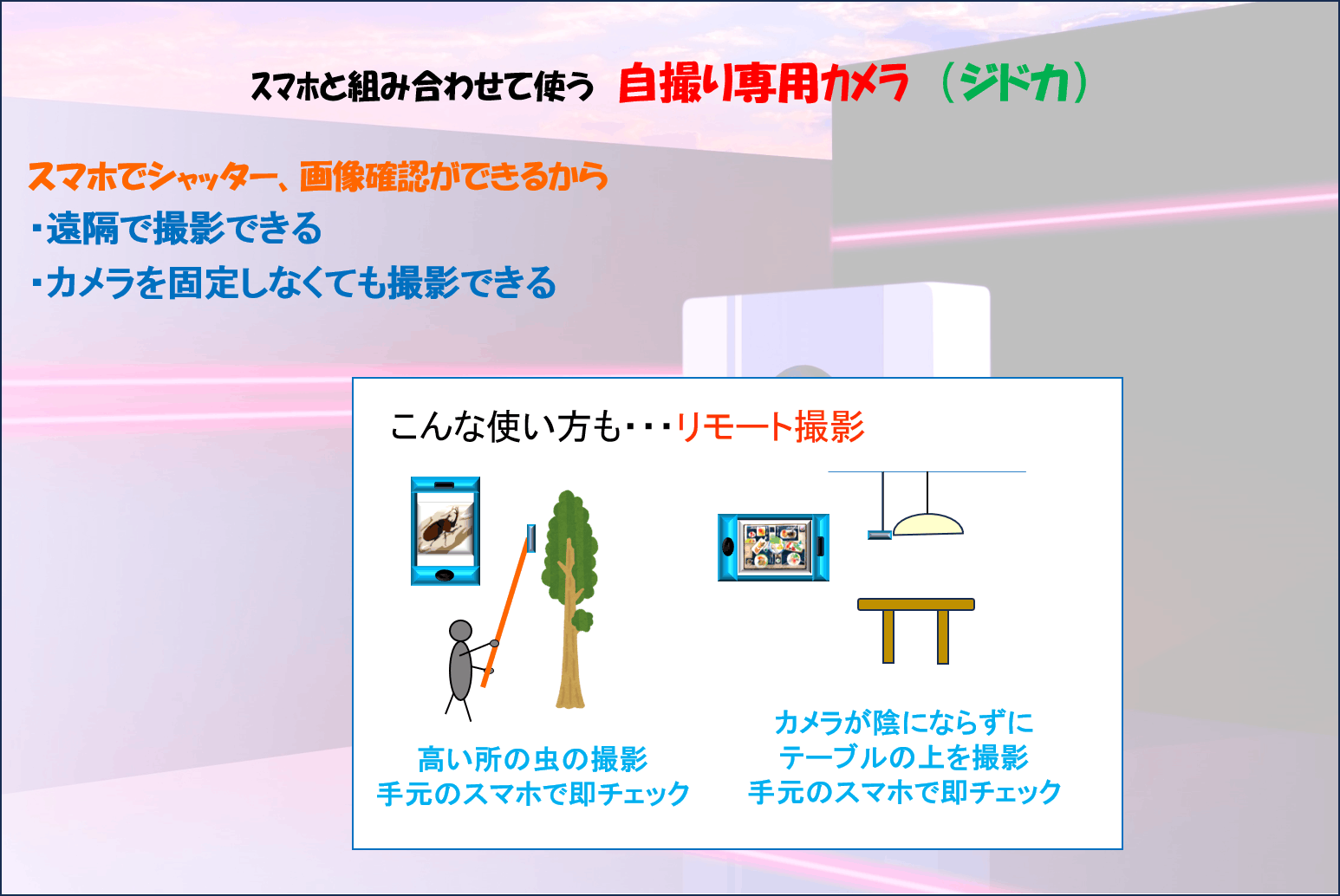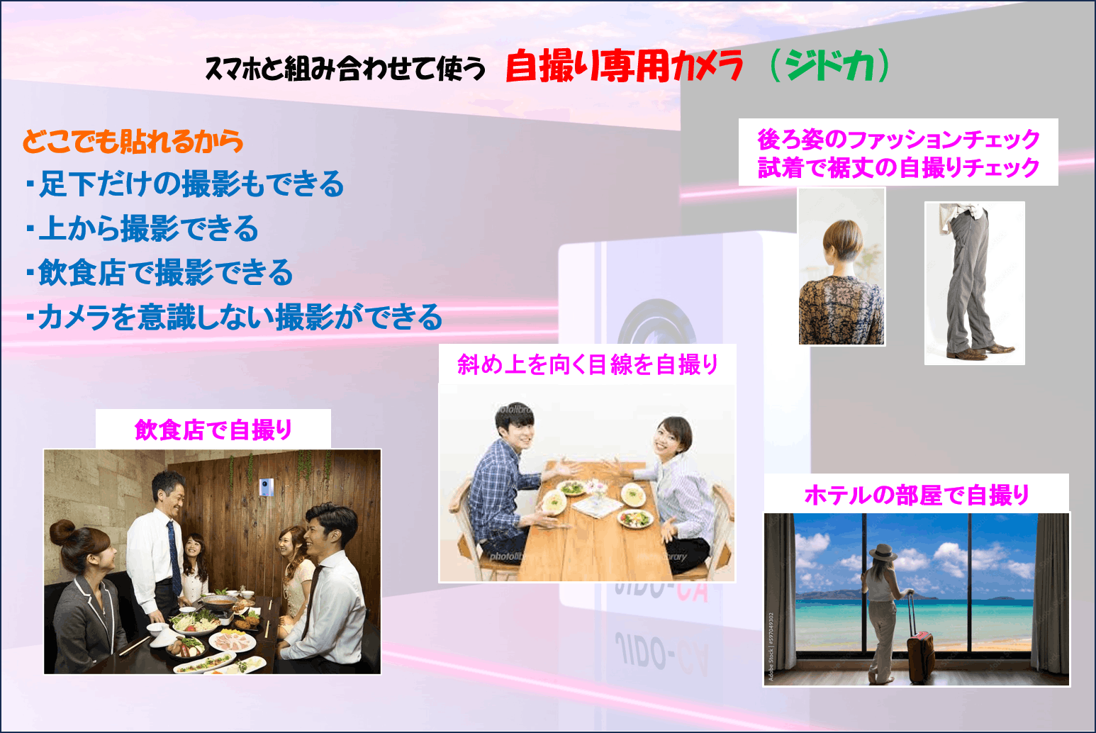 壁に貼って使えば、飲食店、ホテルや試着室でも自撮りができます。