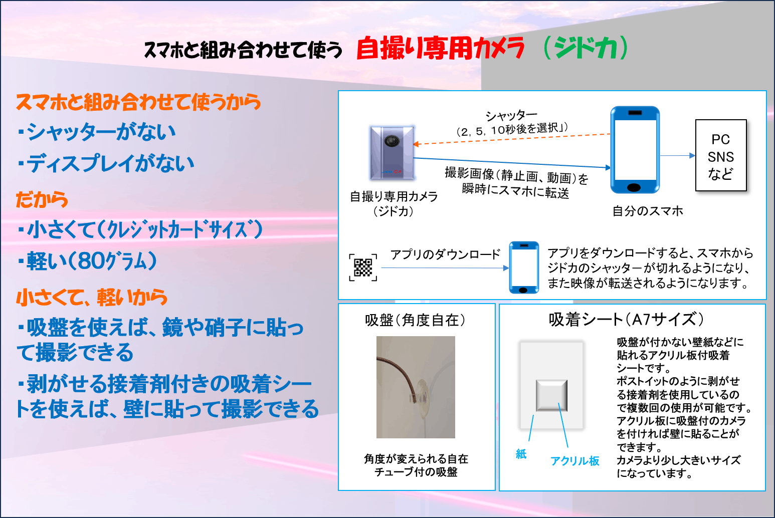 スマホと組み合わせ使う自撮り専用のカメラです。カメラにシャッターもディスプレイもないので、小さくて軽いカメラとなっています。そして、小さくて軽くてので、吸盤を使えば鏡やガラスの貼れて手ぶらで自撮りができます。