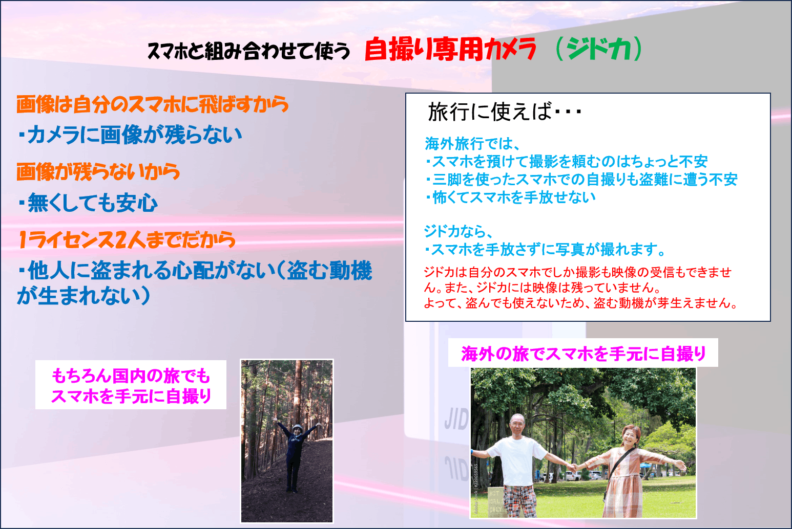 カメラに画像が残らないので旅行先でも安心です。