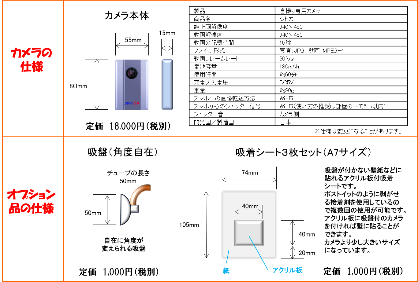 リターンは、ジドカ本体、吸盤(角度自在)と吸着シート3枚セットです。なお、先に第2弾として「知能を持たないアシストロボット」の販売を予定していると書きましたが、この商品は2万円前後での販売を予定しています。今回ご支援いただいた方には、 「知能を持たないアシストロボット」の2割引のチケットを送付させていただきます。販売が確定している訳ではなく恐縮ですが、リターンに含めさせていただきます。