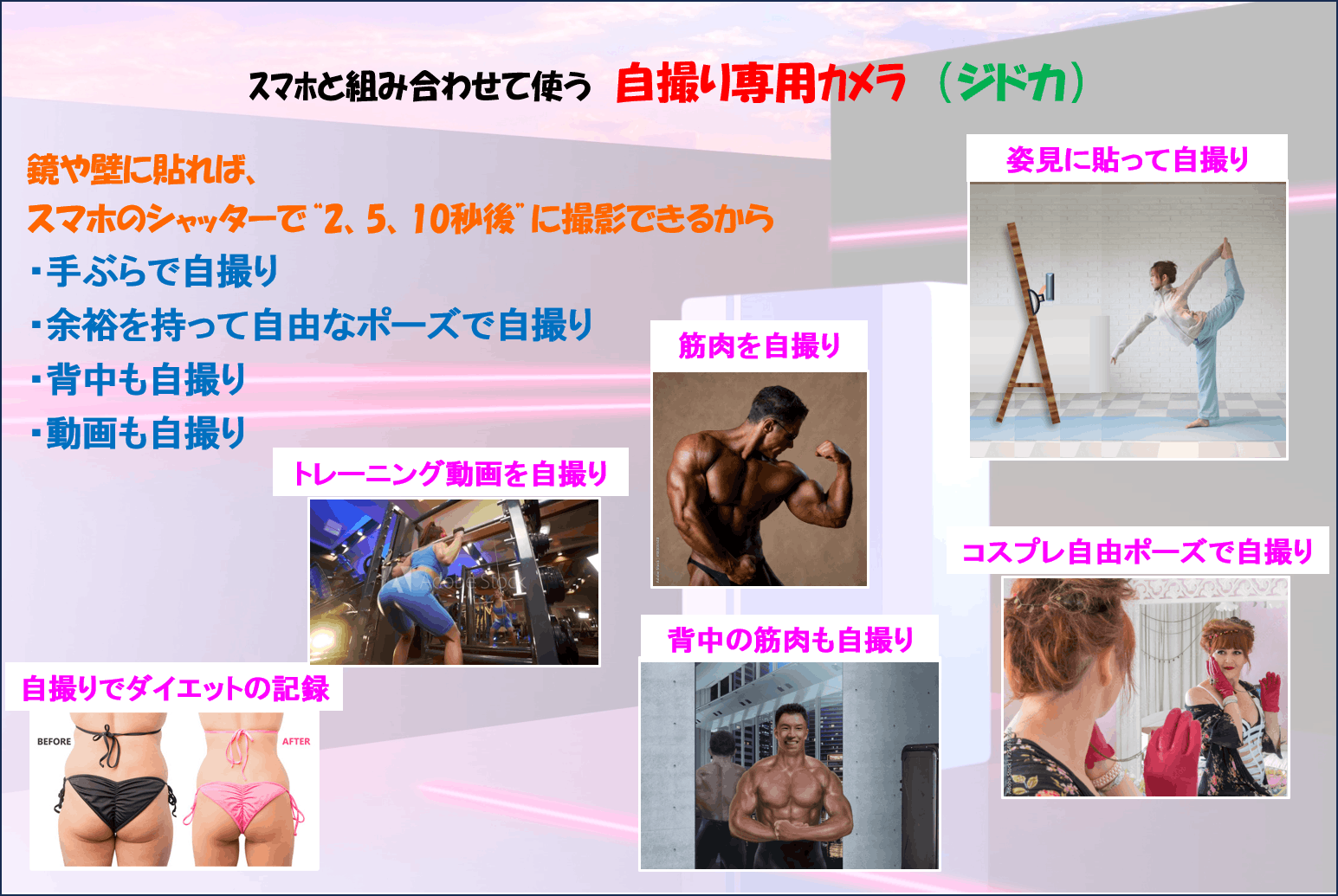鏡に貼って使えば、筋肉美やトレーニング姿、コスプレ、ダイエットなど色々な自撮りができます。