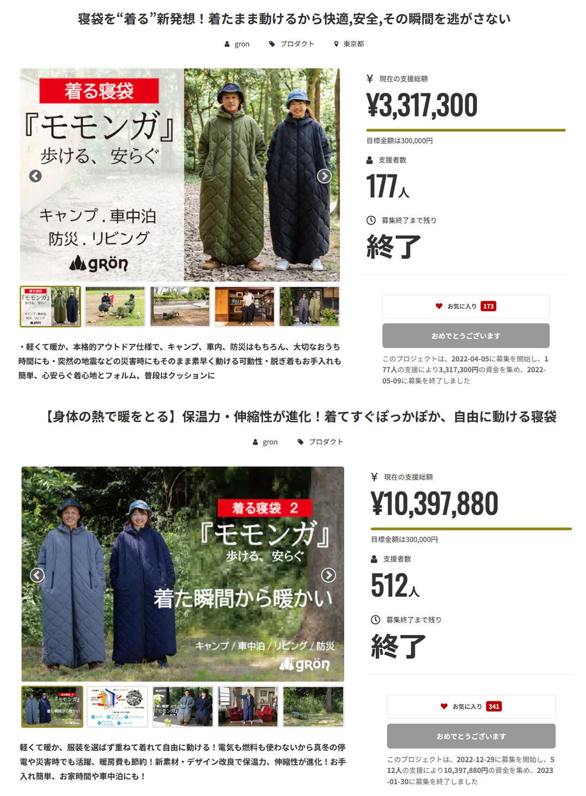 第1弾「モモンガ」ではサポーター117人、達成率1105%、第2弾「モモンガ2」ではサポーター512人、達成率3465%と多くの反響をいただくことができました。本当にありがとうございました。