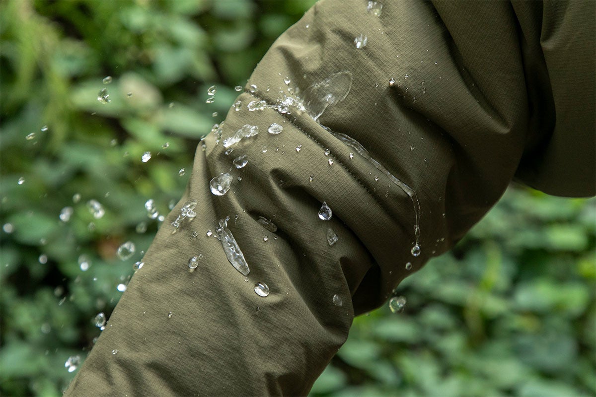 表地には引き裂け強度のあるナイロンリップストップ生地に撥水加工を施し、水をはじき汚れにくくなっています。また、ストレッチ性があるので動きやすく、肌触りはマットでサラリとしています。
