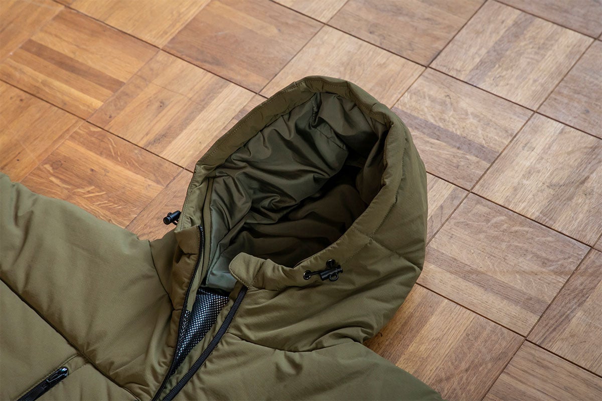 保温効果の高い裏地を使用しています。シルバーカラーの裏地にはポリエステルメッシュをボンディングし、身体の熱を逃がしにくく暖かさをキープします。