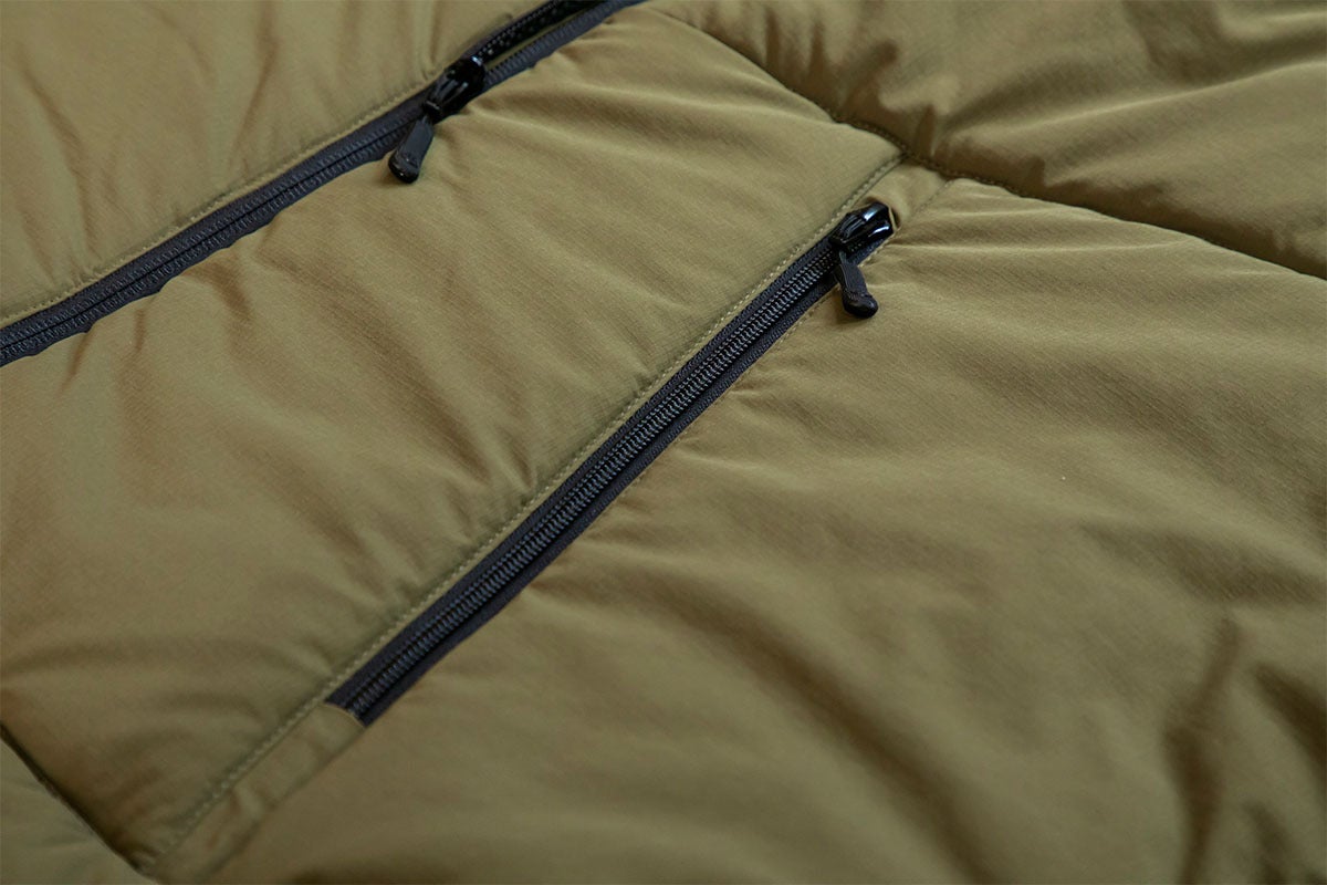 大事なものを収納するファスナーポケットと手指を温める袋布がフリース素材のボトムポケットを備えています。