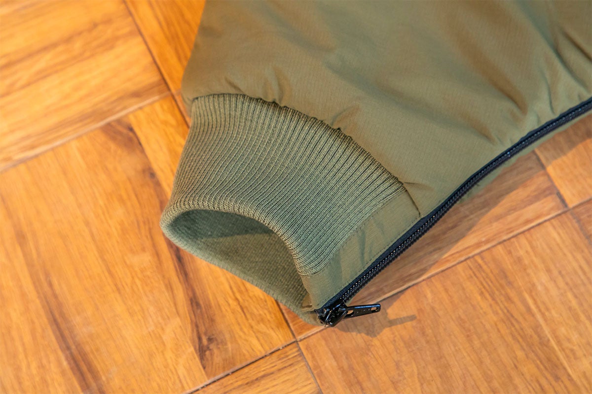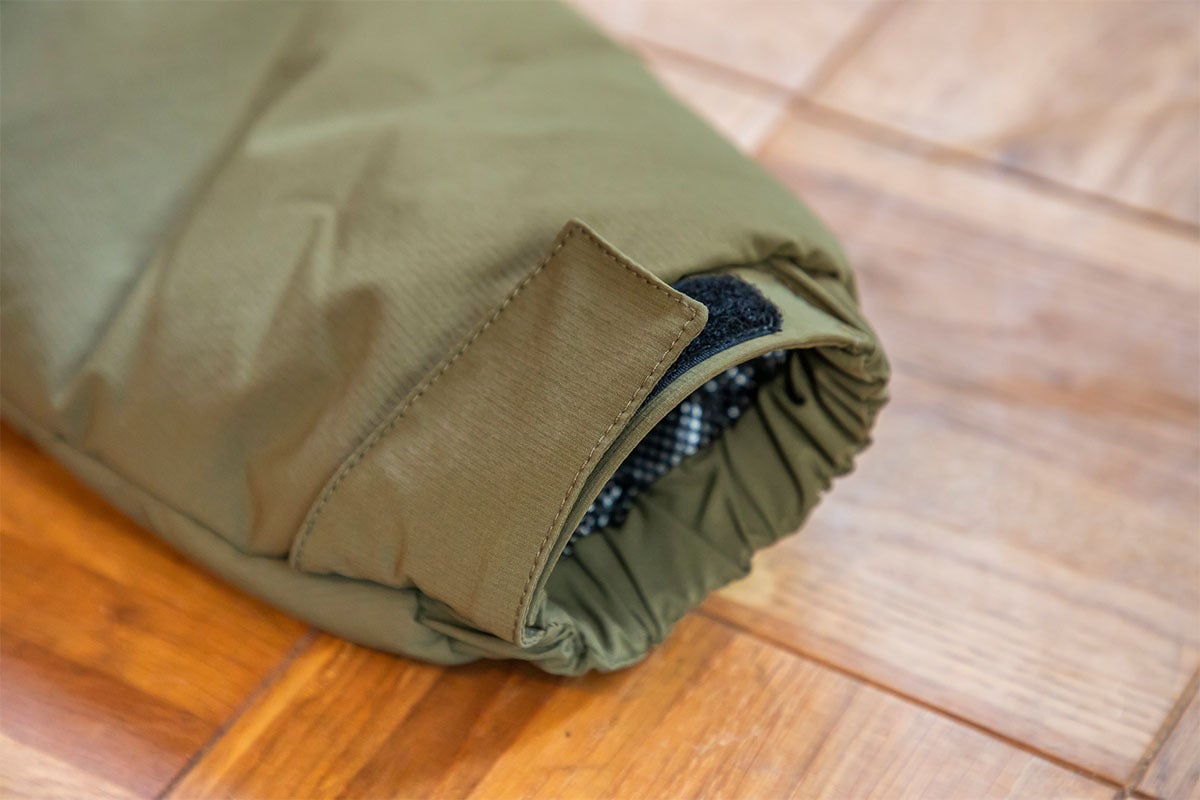 袖口はマジックテープで調整可能、足口はリブで冷気の侵入を防ぎます。