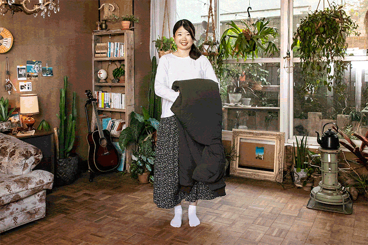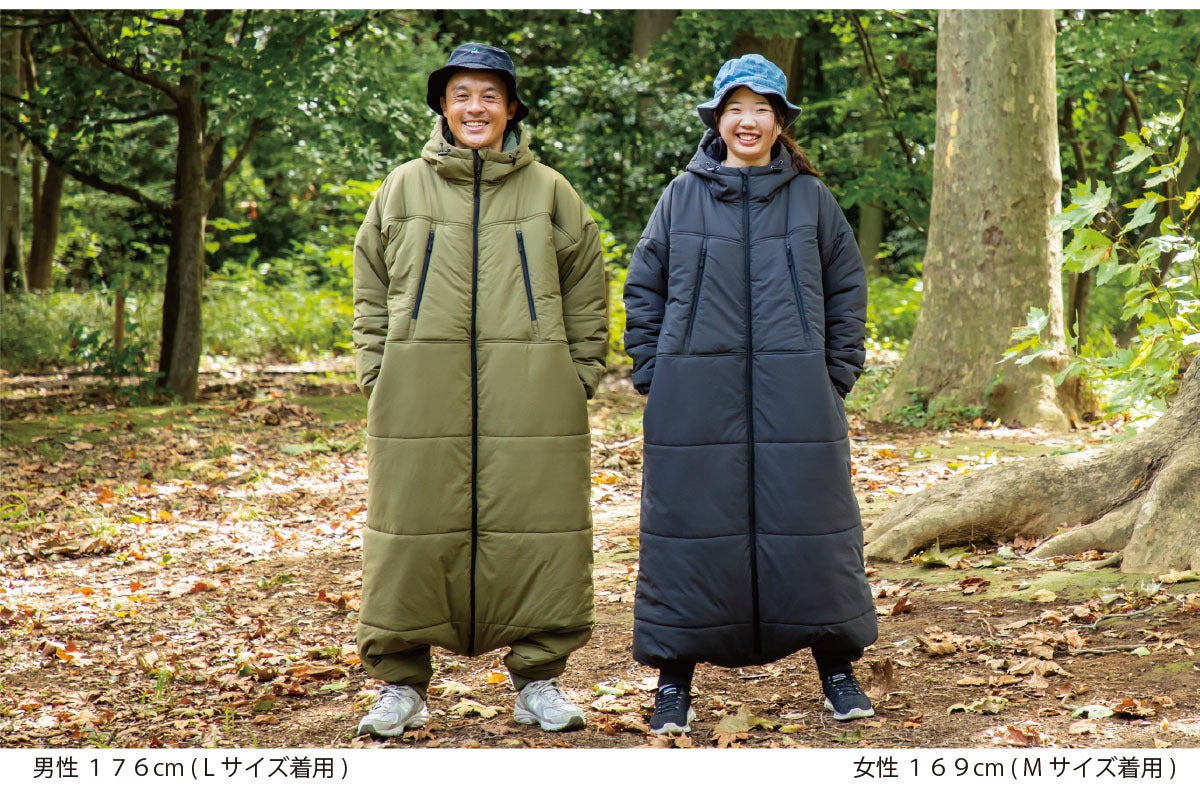 封筒型寝袋から派生したデザインはロングスカートでもスーツでもそのまま上に重ねて簡単に着用できます。
