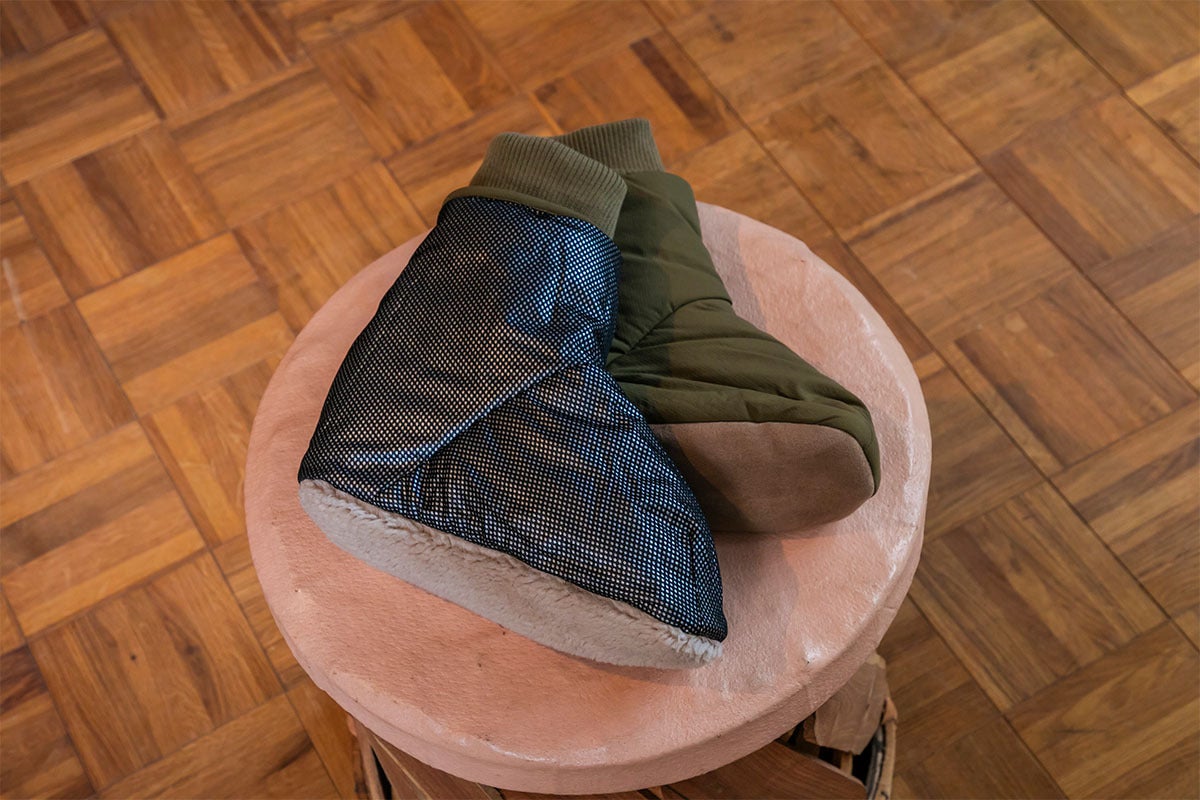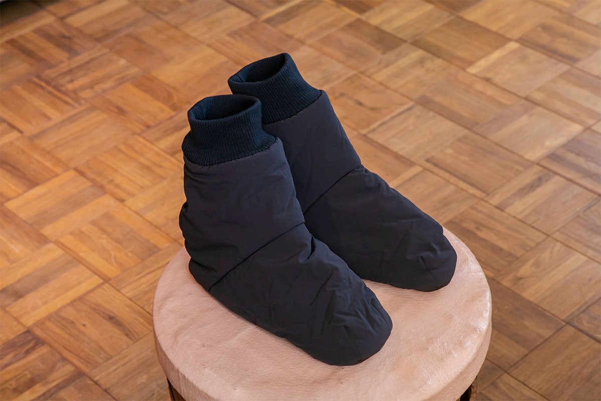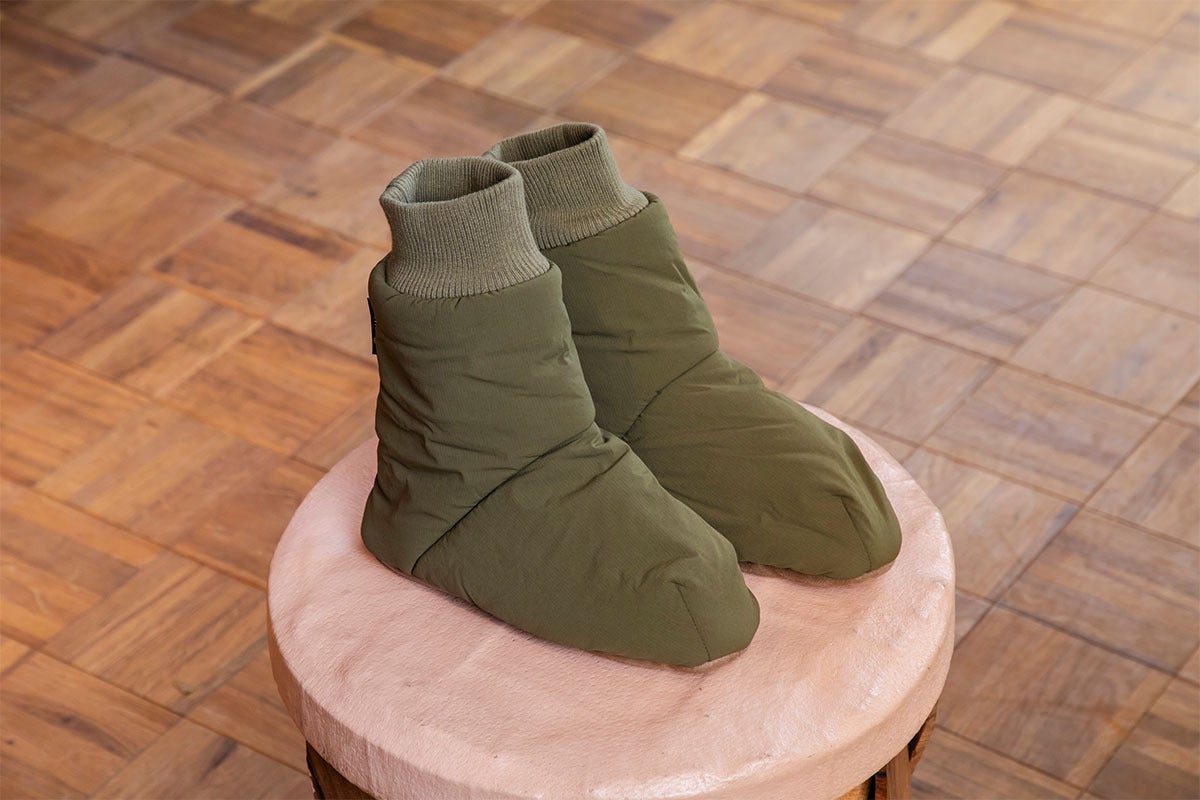 「ルームソックスシューズ」を作りました。アウトドアではテントの中で履くテントシューズが一般的ですが、もっと楽に履けるよう靴下風のデザインにしました。中綿にはモモンガエクストラと同じサーモライト中綿を使用し、裏地は保温裏地を使っています。内底はボアで暖かく、外底はポリエステルスウェードで滑りにくくなっています。とてもとても暖かいです。(外履き用ではありません。テント内や室内でご使用ください。)