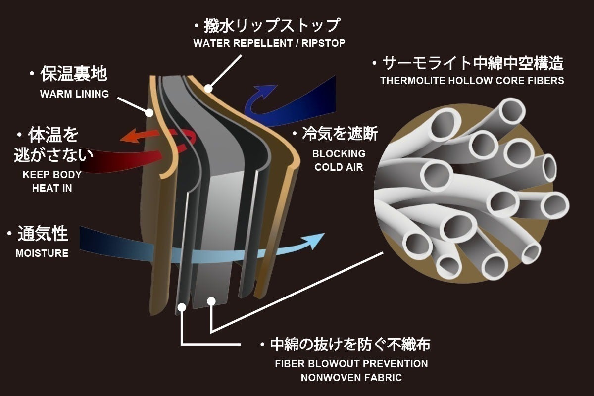 優れた保温性を持つインビスタ社のサーモライト中綿は、機能性が求められるスポーツ・アウトドア分野で数多くのアウターや寝袋を中心に使用されてきました。独自の繊維構造により暖かく快適さを提供する軽量保温素材です。