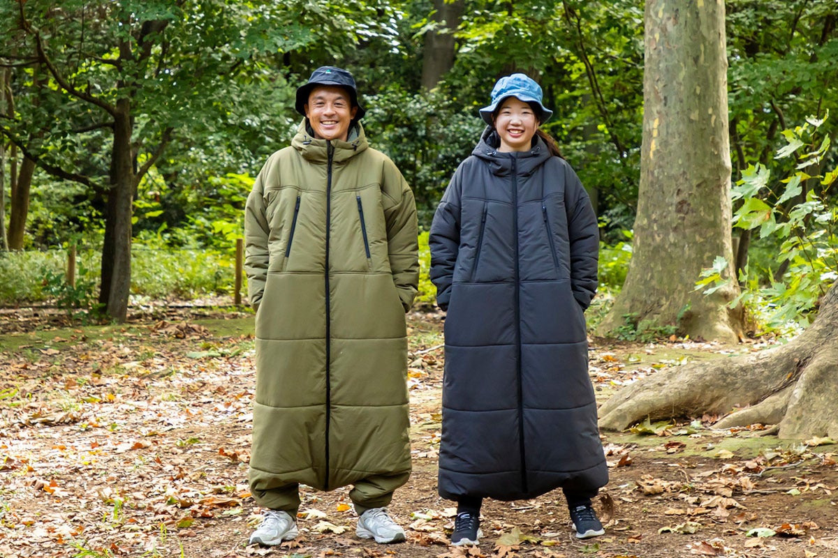 封筒型寝袋から派生したデザインはロングスカートでもスーツでもそのまま上に重ねて簡単に着用できます。
