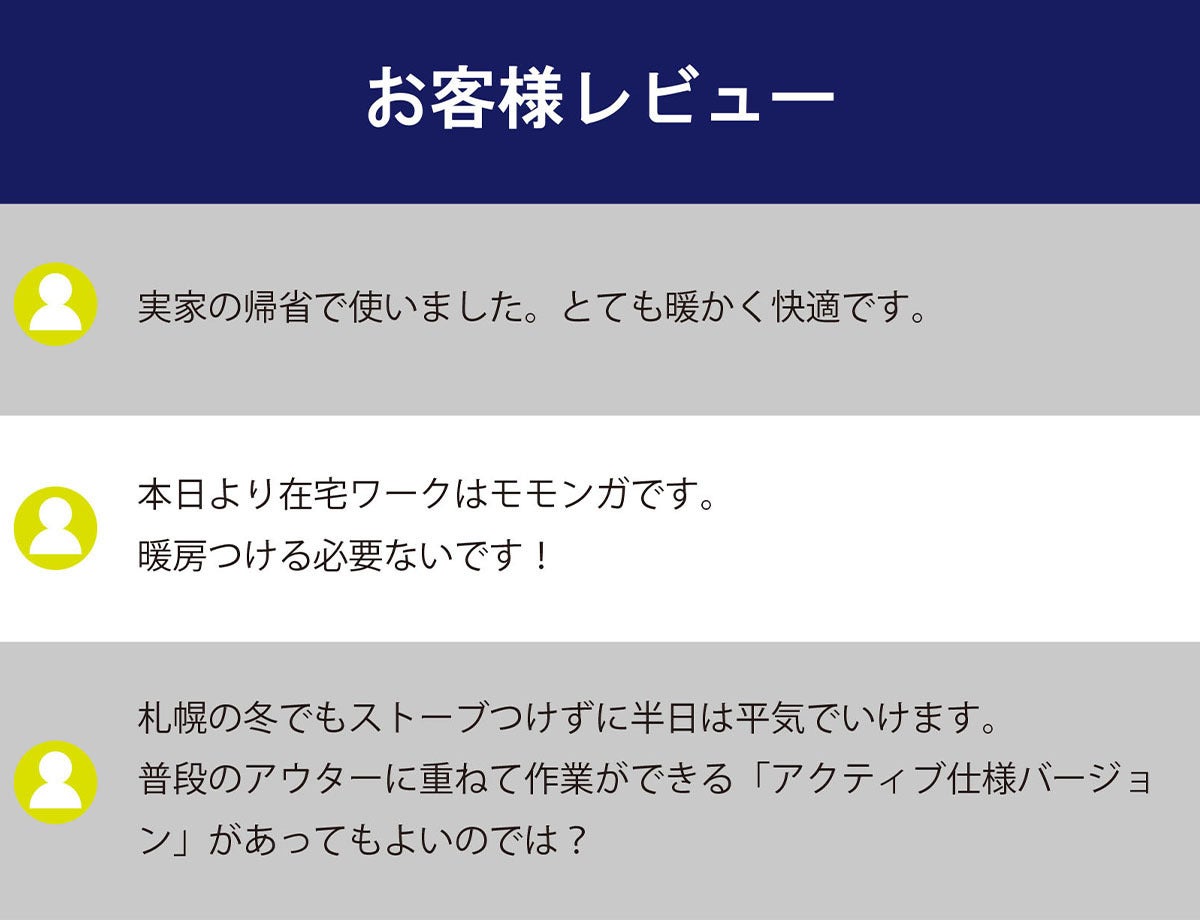冬キャンプ、釣り、天体観測、風景撮影など長時間を寒い野外で過ごされる方にオススメです。また、寒さがとことん苦手な方や暖房費の節約をお考えの方にもお家使いで”着る暖房”をご実感いただけます。
