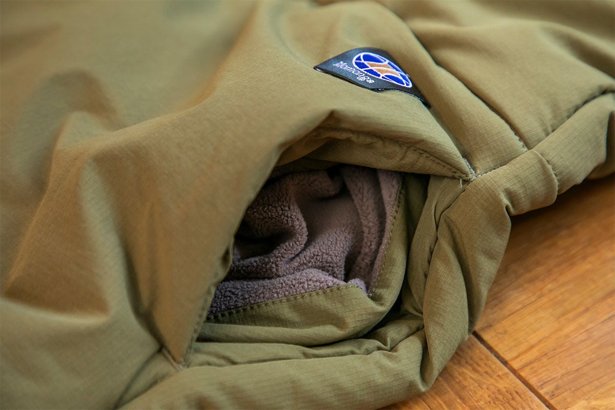 大事なものを収納するファスナーポケットと手指を温める袋布がフリース素材のボトムポケットを備えています。