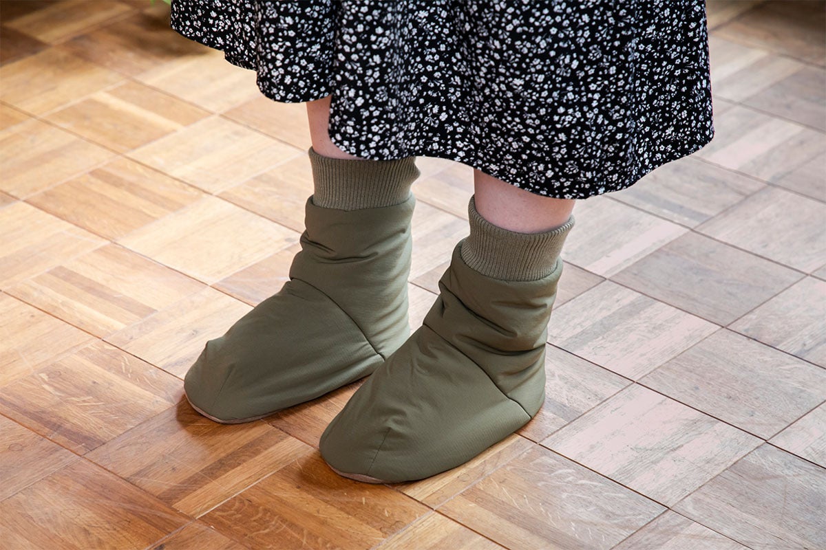 「ルームソックスシューズ」を作りました。アウトドアではテントの中で履くテントシューズが一般的ですが、もっと楽に履けるよう靴下風のデザインにしました。中綿にはモモンガエクストラと同じサーモライト中綿を使用し、裏地は保温裏地を使っています。内底はボアで暖かく、外底はポリエステルスウェードで滑りにくくなっています。とてもとても暖かいです。(外履き用ではありません。テント内や室内でご使用ください。)