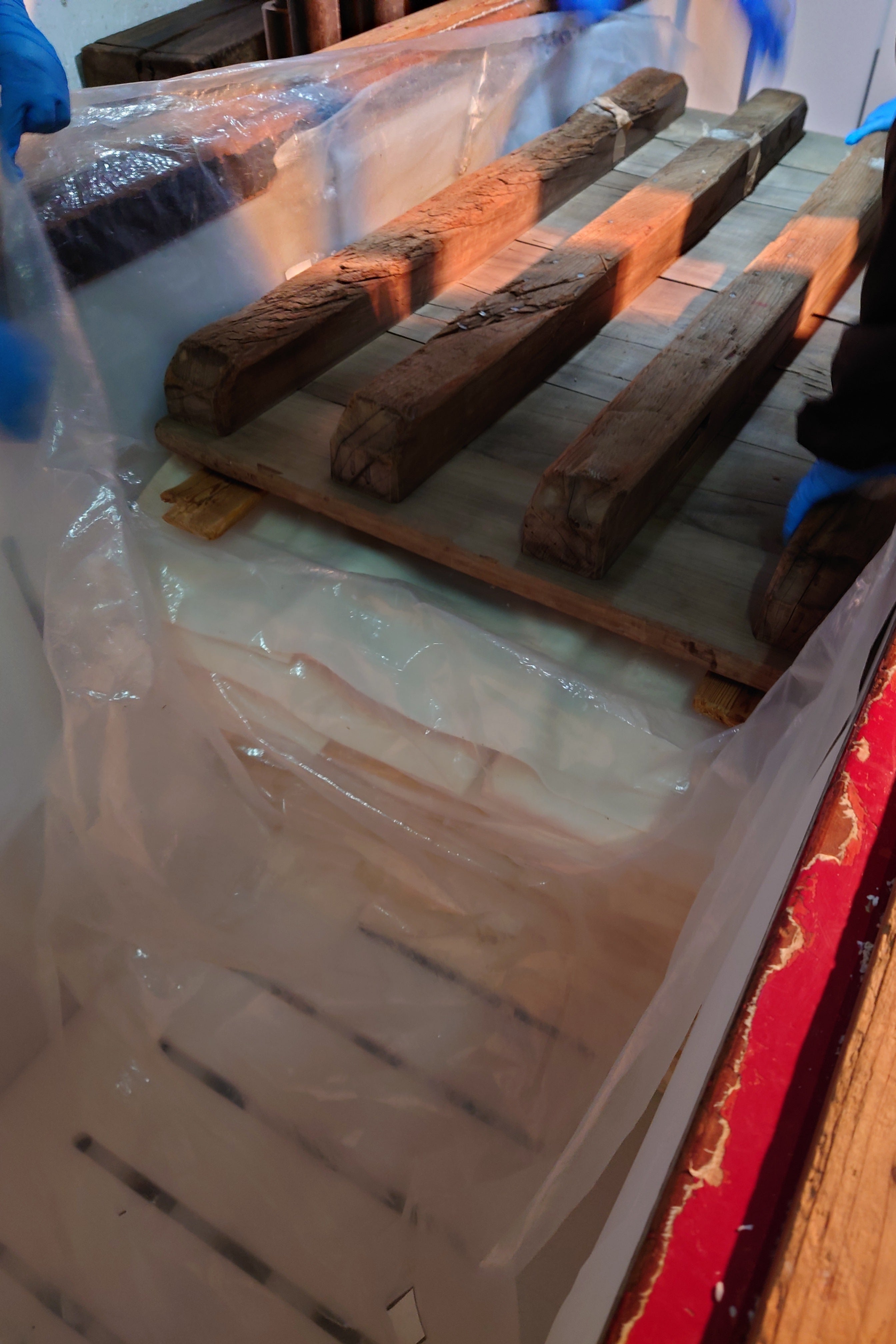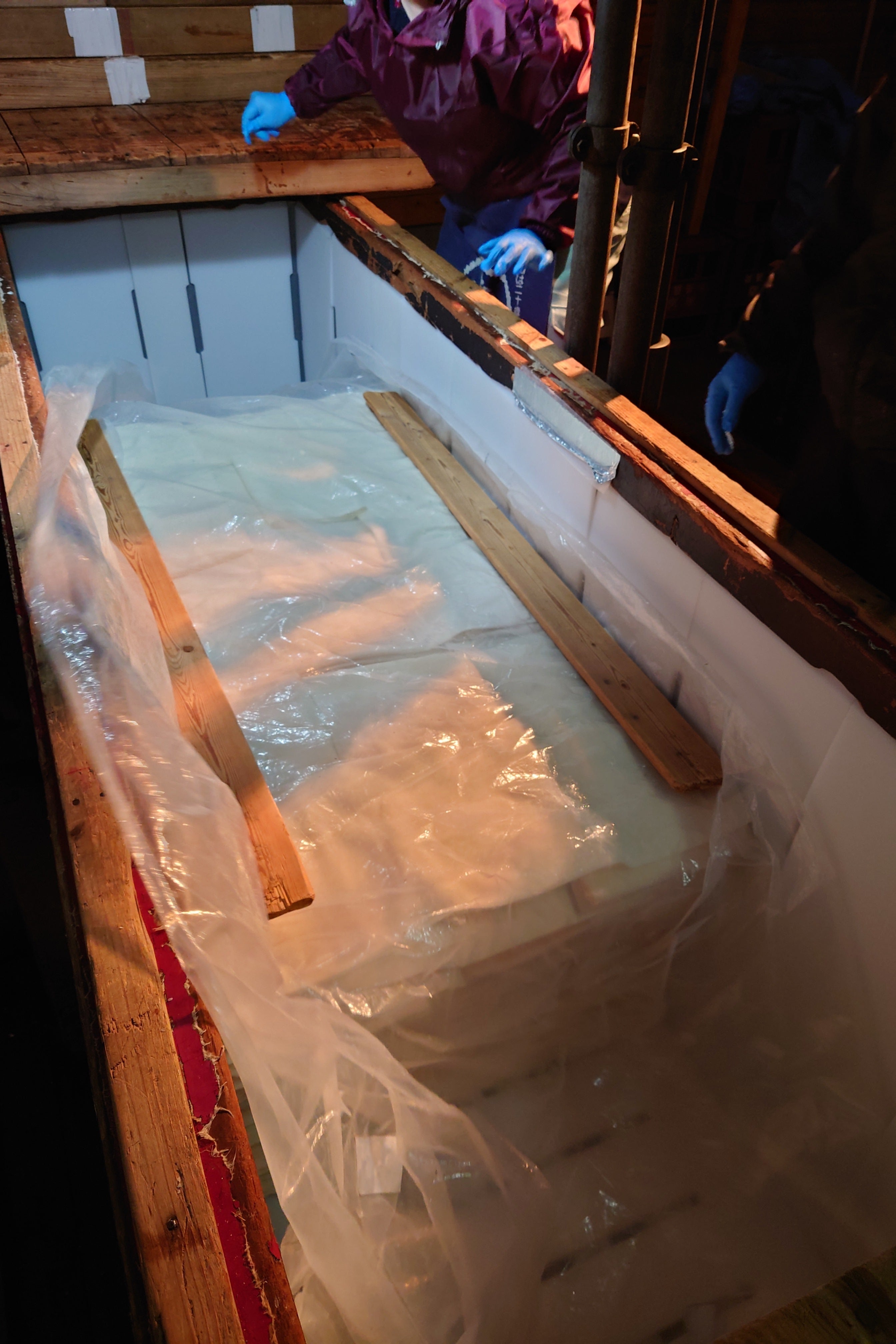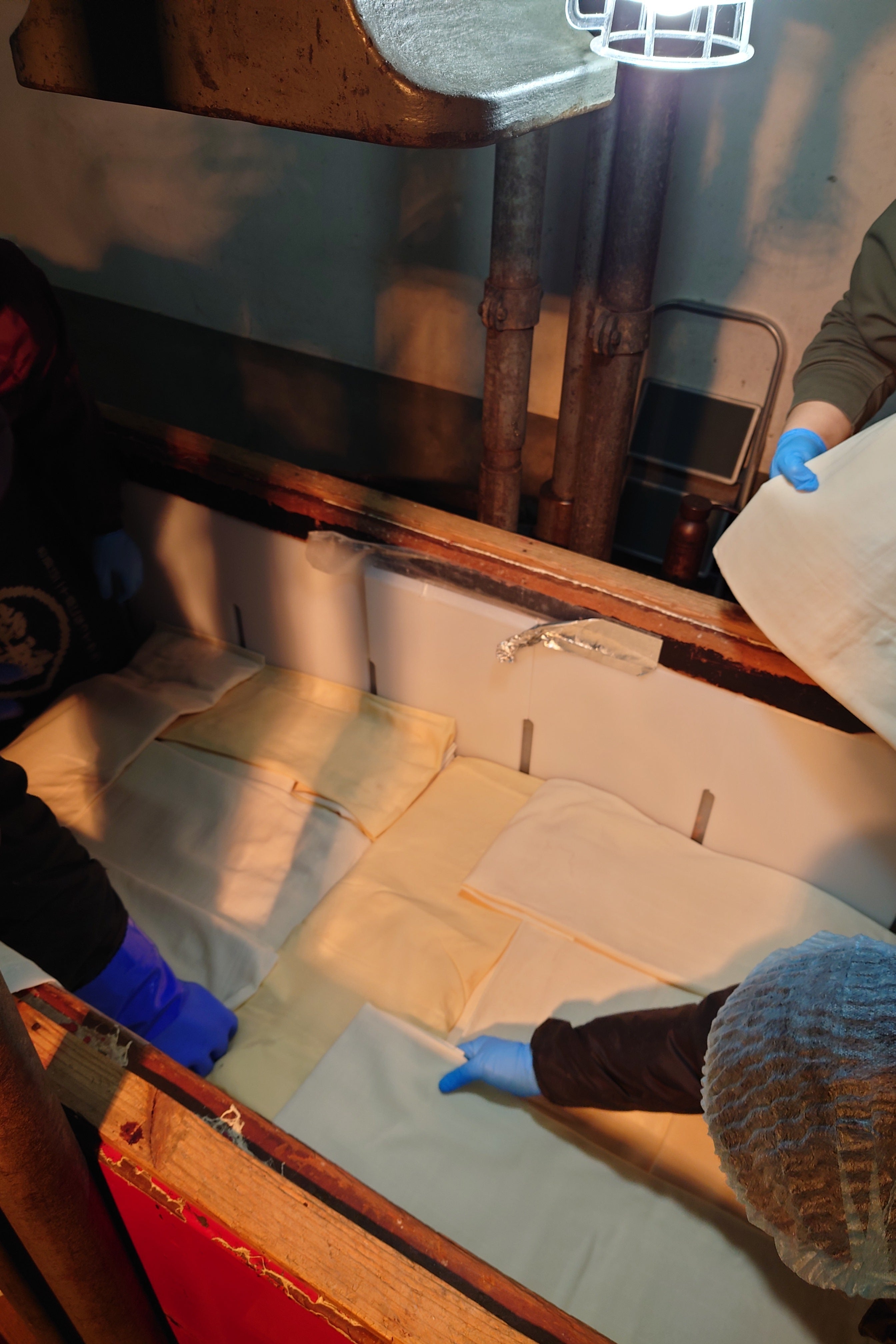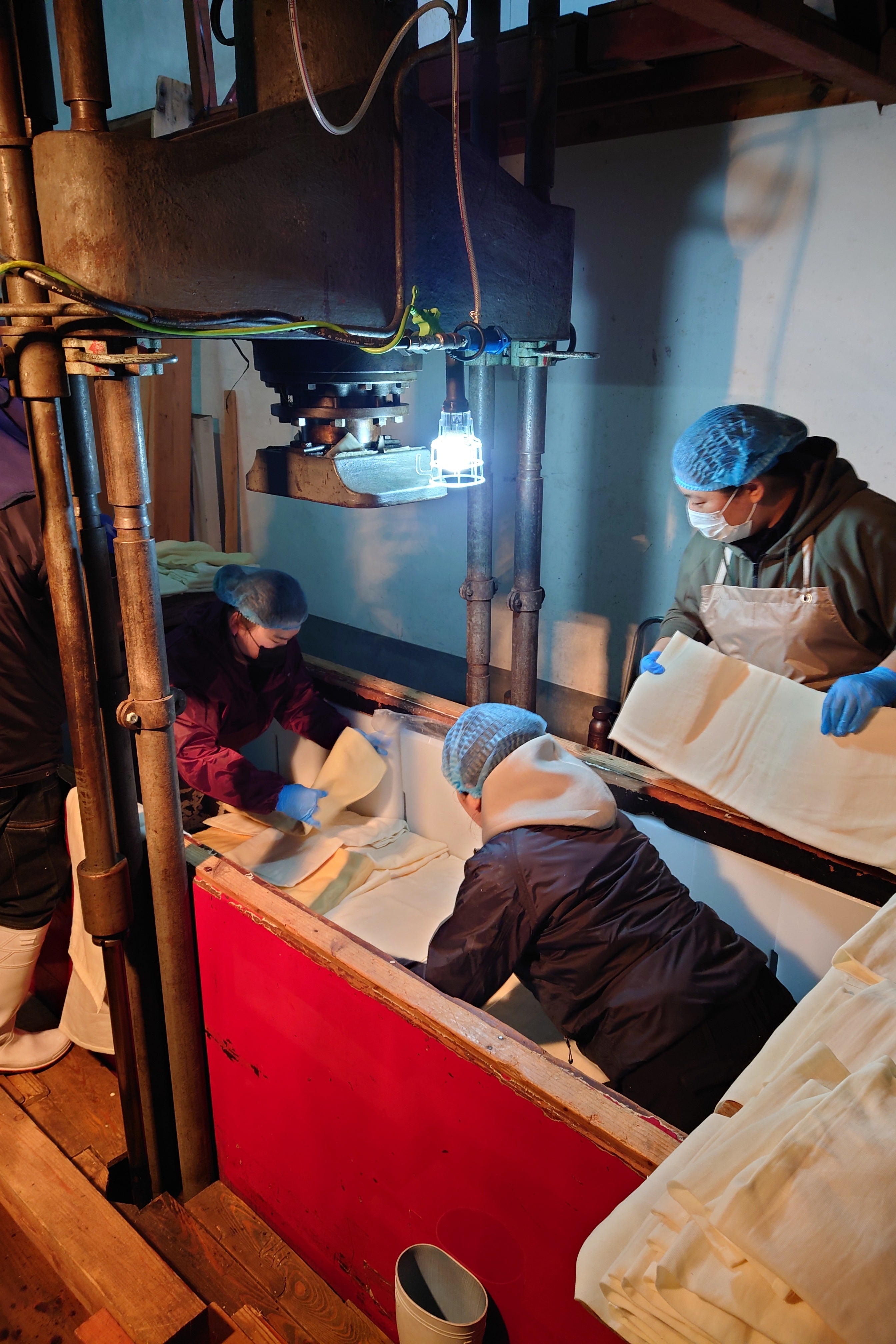 槽の中の酒袋を全て取り出し、袋の積み替えを行いました。
