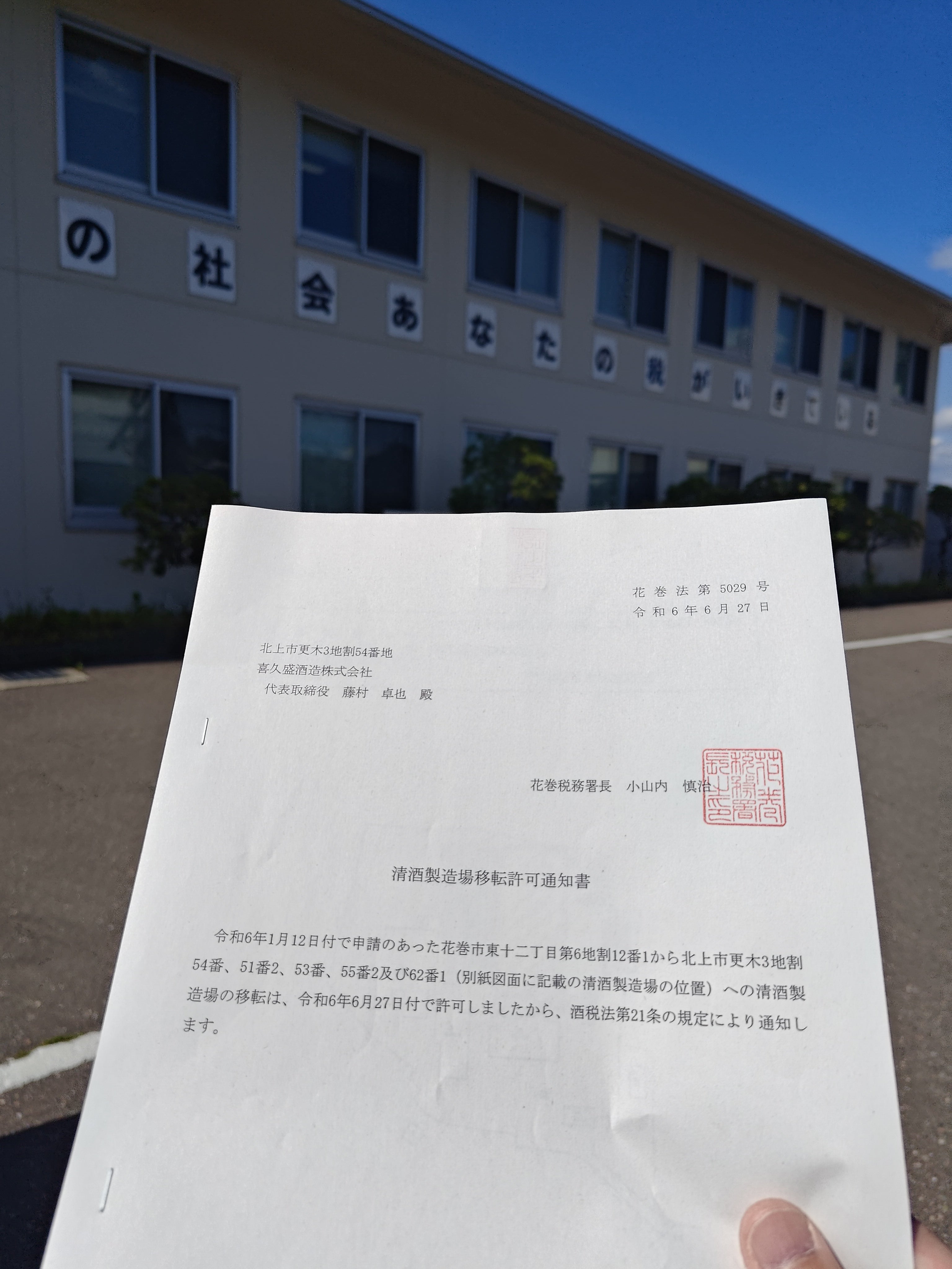 そんな中、ようやく昨日(令和6年6月27日)花巻税務署より『清酒製造場移転許可通知書』をいただく事ができましたので、これでやっと新工場での製造が可能となります。