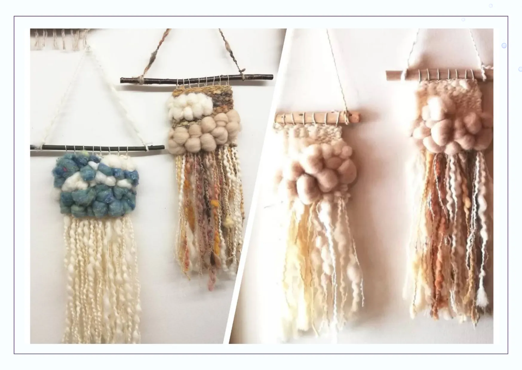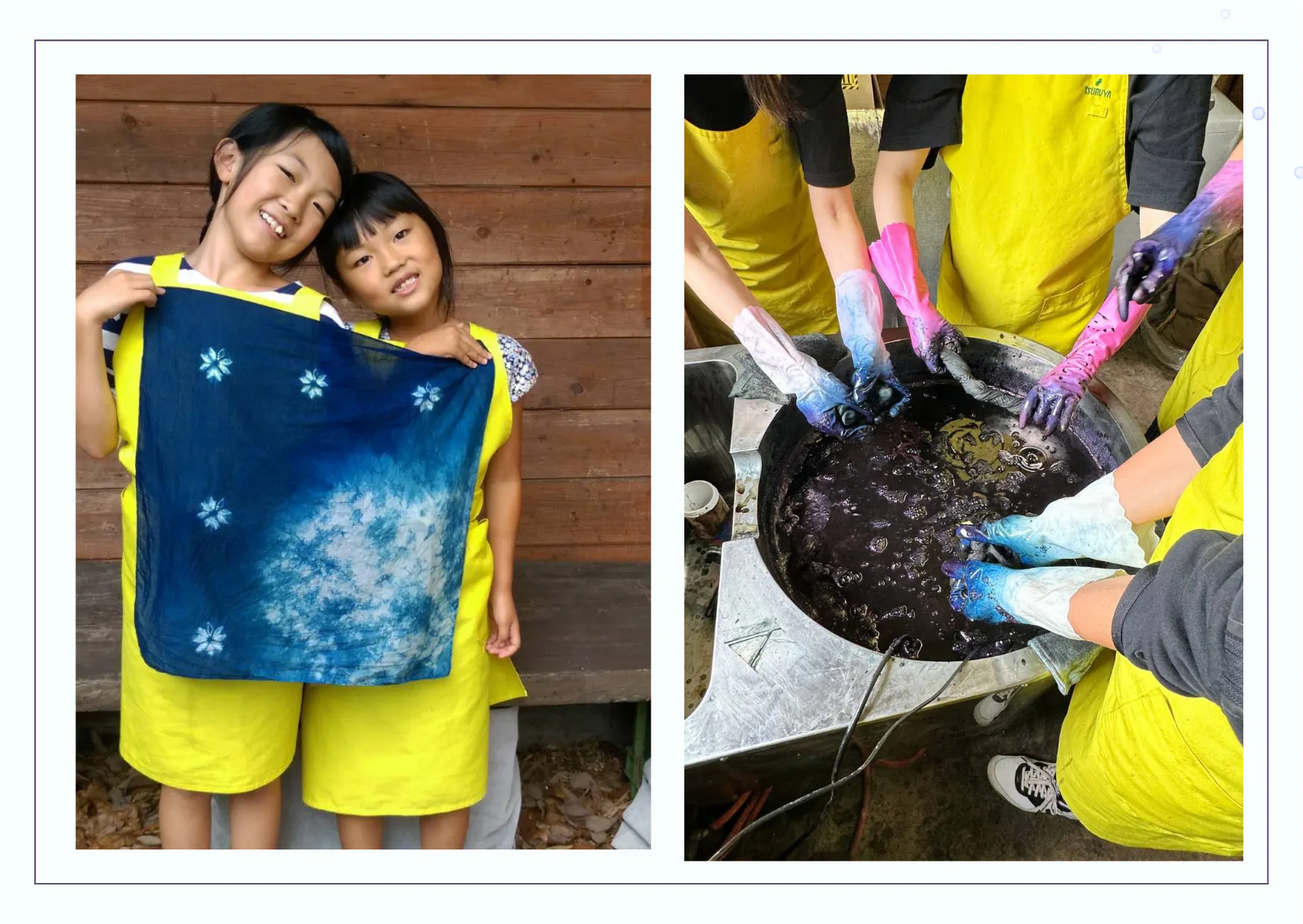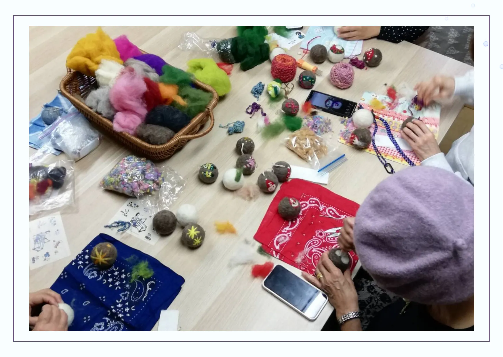 霧下織工房では春から夏は藍染体験、秋冬は羊毛フェルトや手紡ぎ糸でのコースターやタペストリー体験が人気です。