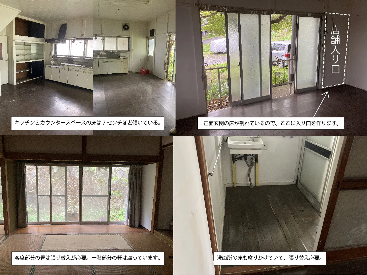 とにかくすべての条件が悪く、資金も全然足りない。傾いている床を水平にしたり、朽ちている軒を直したり、もともと民家だから、厨房も一から作らないといけない。家を囲むように立つ木の剪定も大変そう。屋根もちょっと怪しい。
