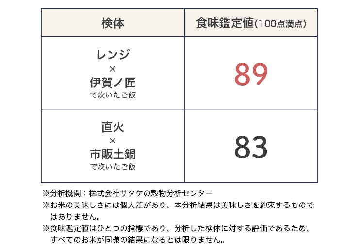 直火で炊いた土鍋ご飯と、伊賀ノ匠で炊いたレンジ土鍋ご飯の味を比較するため、お米の粘り・硬さ・外観などを総合的に評価する「食味鑑定値」の測定を依頼。
