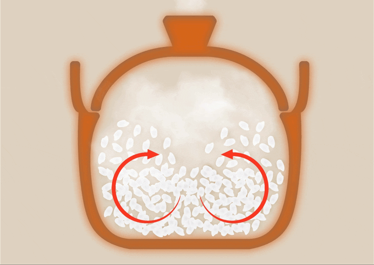 レンジ炊きで短時間で美味しく炊き上げるためには、お米の芯までムラなく熱が伝わることが大切。底から上層へ対流が生まれると熱が均一に伝わり、一粒一粒がふっくらと膨らみ美味しく炊きあがります。