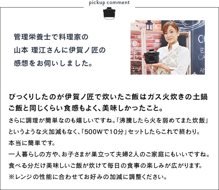 伊賀ノ匠専用の「炊き込みごはんレシピ」を考案していただいた料理家の山本さんに感想をいただきました。