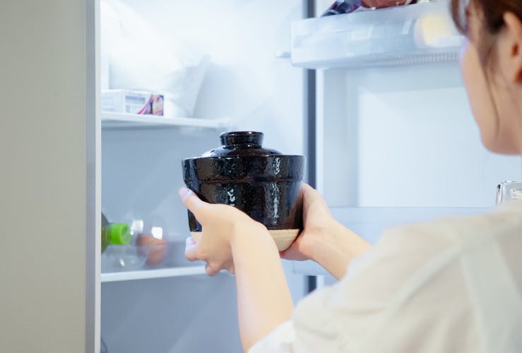 お米の水分を調整してくれる伊賀焼土鍋はおひつとしても利用可能。冷蔵保存してレンジで温めなおすと水分をほどよく含み、炊き立てのようなふっくらとした仕上がりになりますよ。
