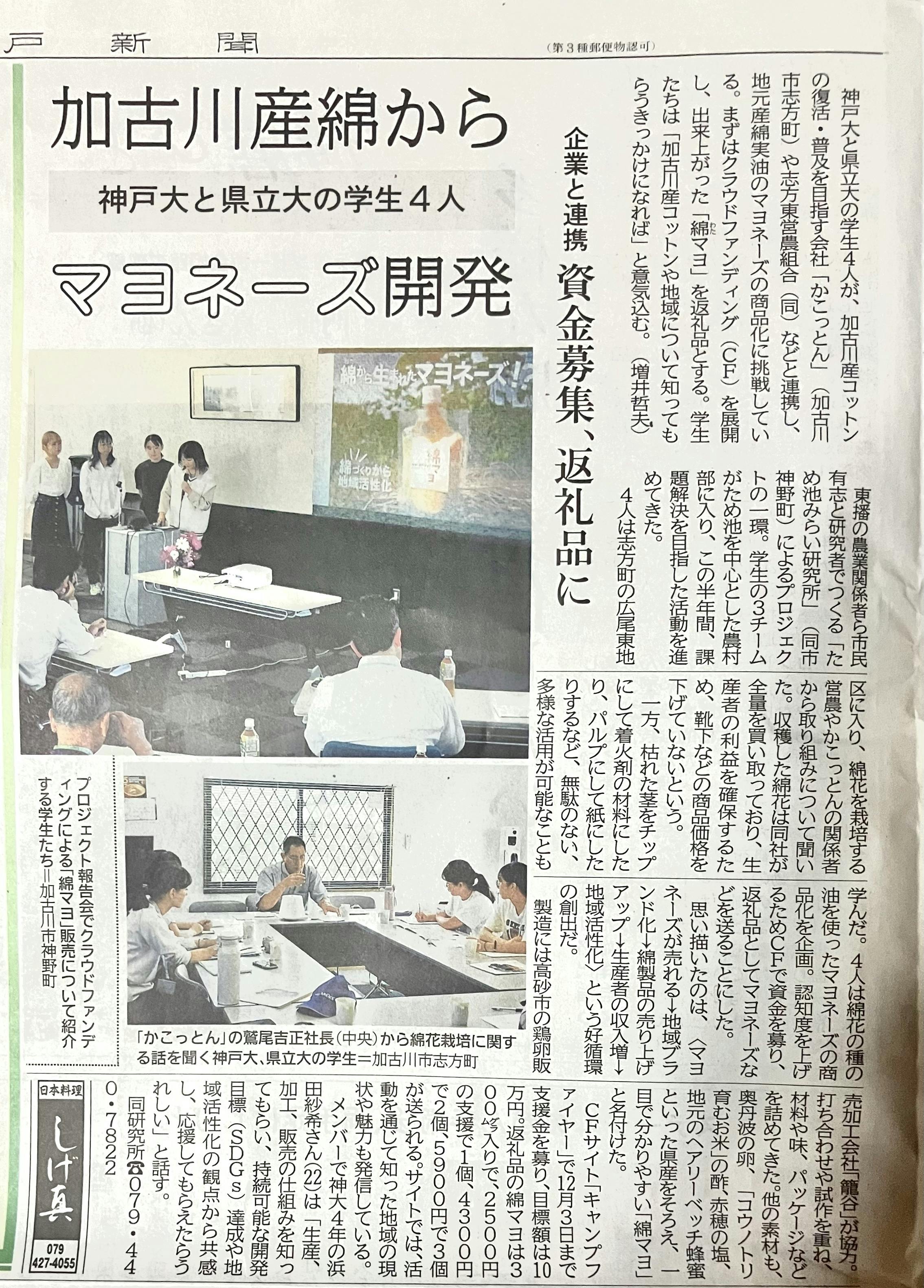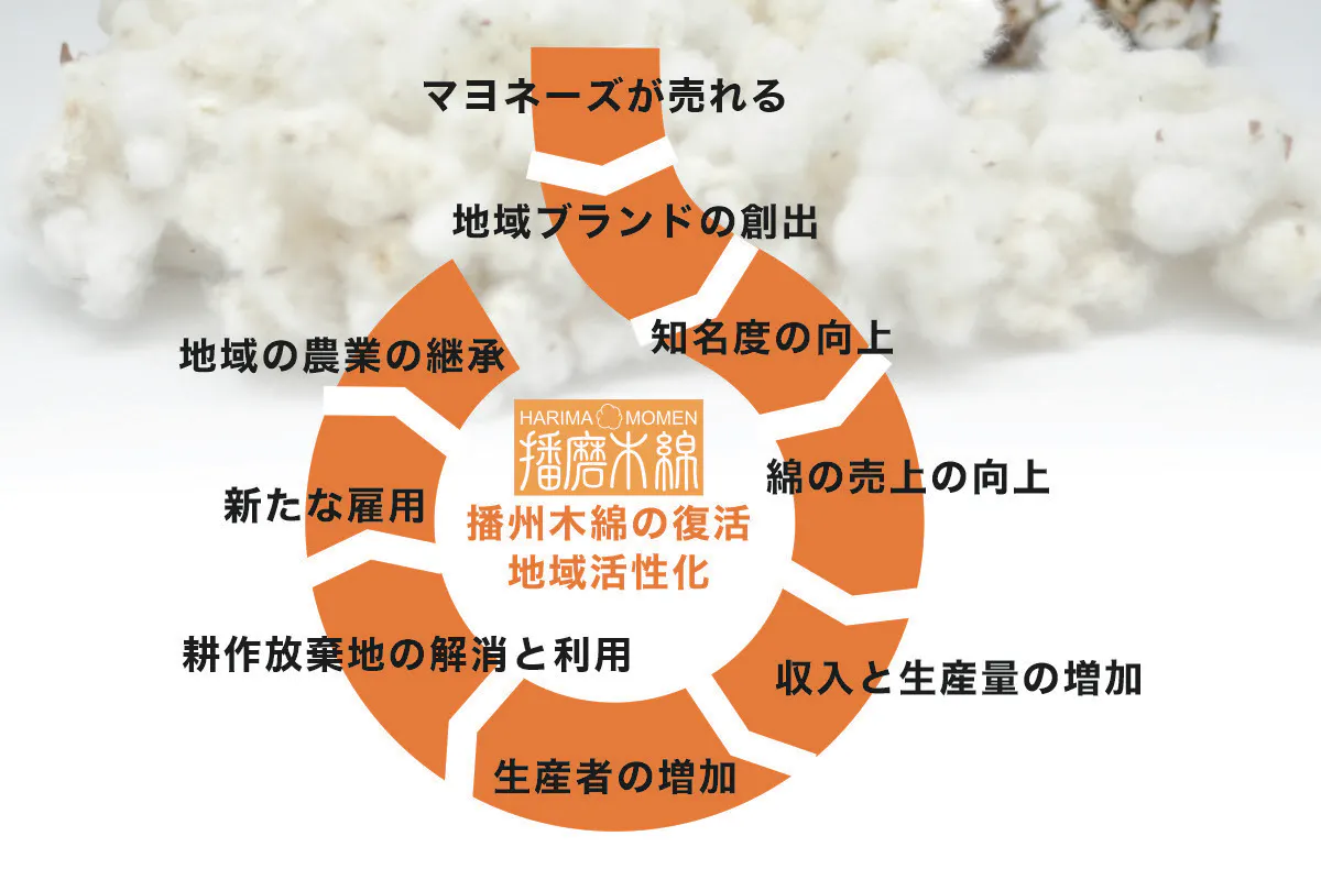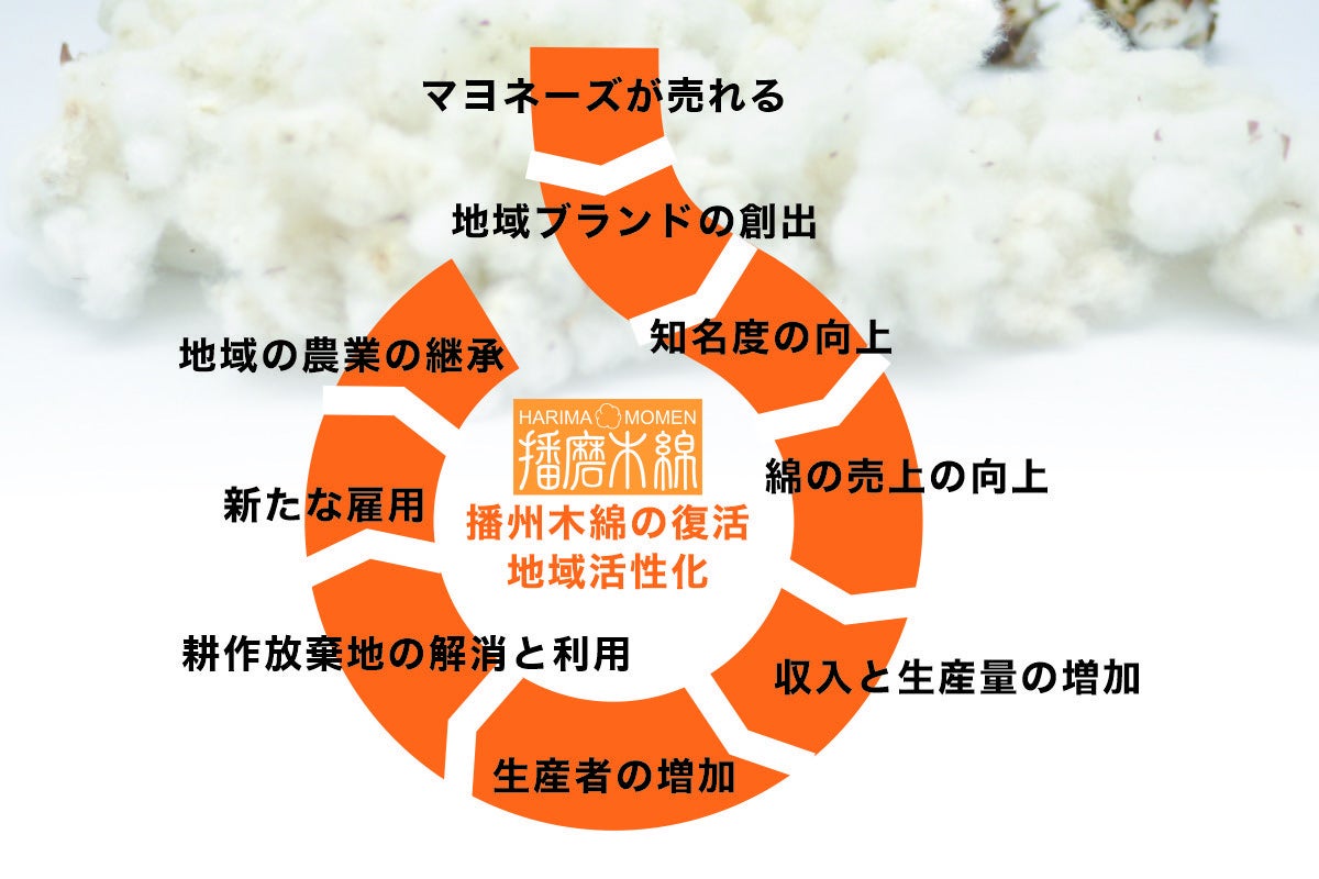 たりあん:5月から私たちは週末に地域に通い、地域の農業者や地場産業の従事者との関係を構築してきました。その中で今回、地域の生産者やかこっとん(株)の代表である鷲尾さんのこだわりが詰まった「綿マヨ」のクラウドファンディングを実施することとなりました。今回のクラウドファンディングを通して、皆様に綿花の新しい利用法や、サステナブルな生産~加工~販売の仕組みを知っていただき、SDGs達成や地域活性化の観点から共感し、応援して頂けると幸いです。