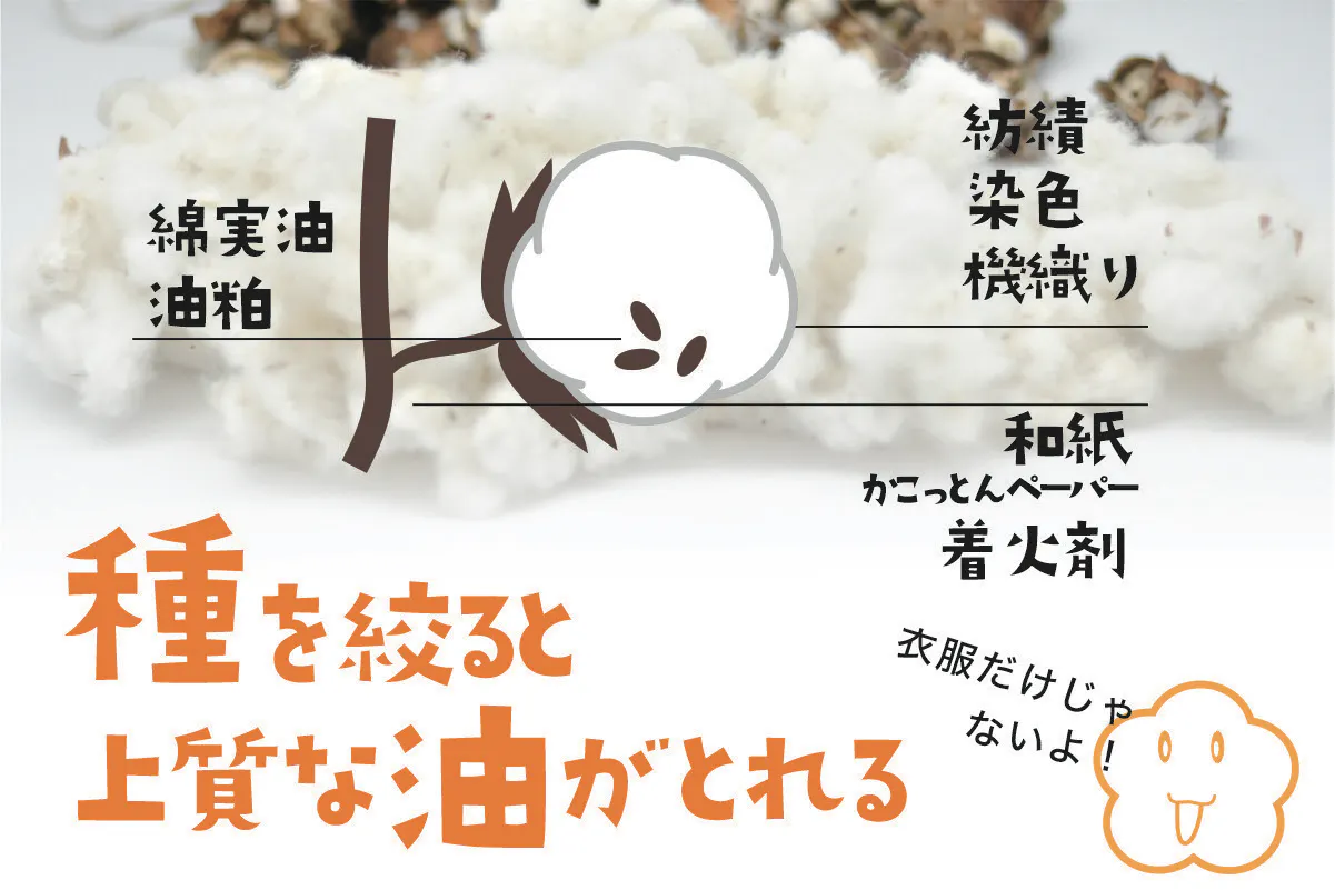 私たちが綿実油のマヨネーズをこのクラファンの中心にした理由は、もっとみなさんに綿のイメージを広げてほしかったからです。綿花と言うとモコモコ部分を衣類に利用するイメージが強いと思います。しかし、実は種も茎も枝も利用できるんです!!