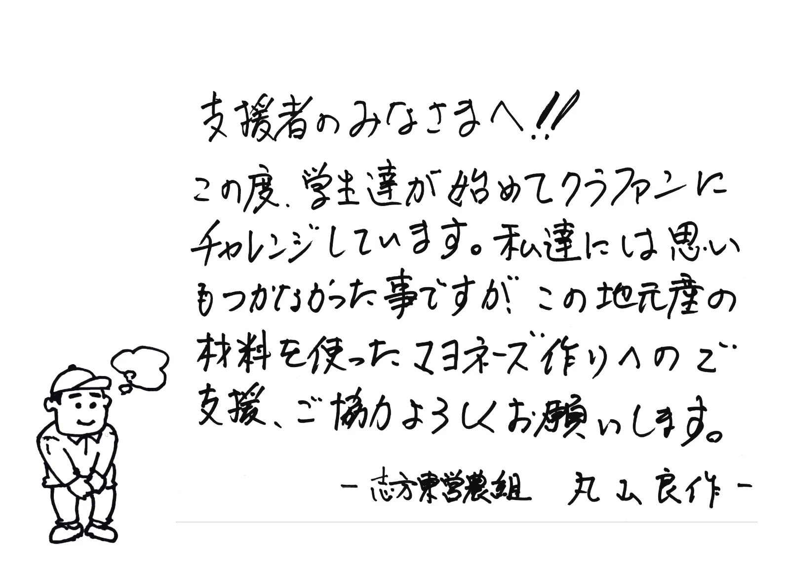 7月からクラファン初心者の学生とファシリテーターの山田さんが中心となり、妥協することなく地域に向き合い、「マヨネーズや綿花だけでなく地域についても知ってもらうにはどんな写真や内容が良いのか?」など、あれこれと考えを巡らせ、議論を重ね、紆余曲折ありながらクラファン実施までたどり着くことができました!!