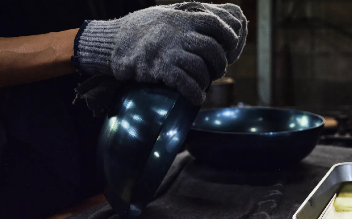 しかし、へら絞り加工は熟練した職人の手によってしか正確に実行することはできません。精密な手仕事によって、フライパンの形状、厚み、そして最終的な重量が決定されます。