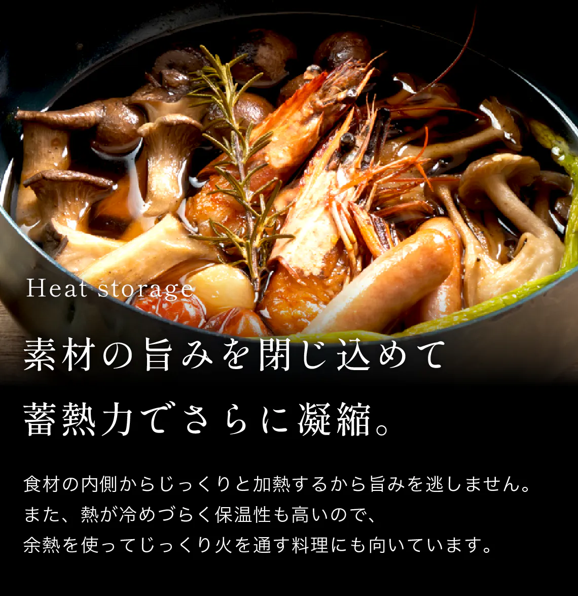 また、熱が冷めづらく保温性も高いので、余熱を使ってじっくり火を通す料理にも向いています。