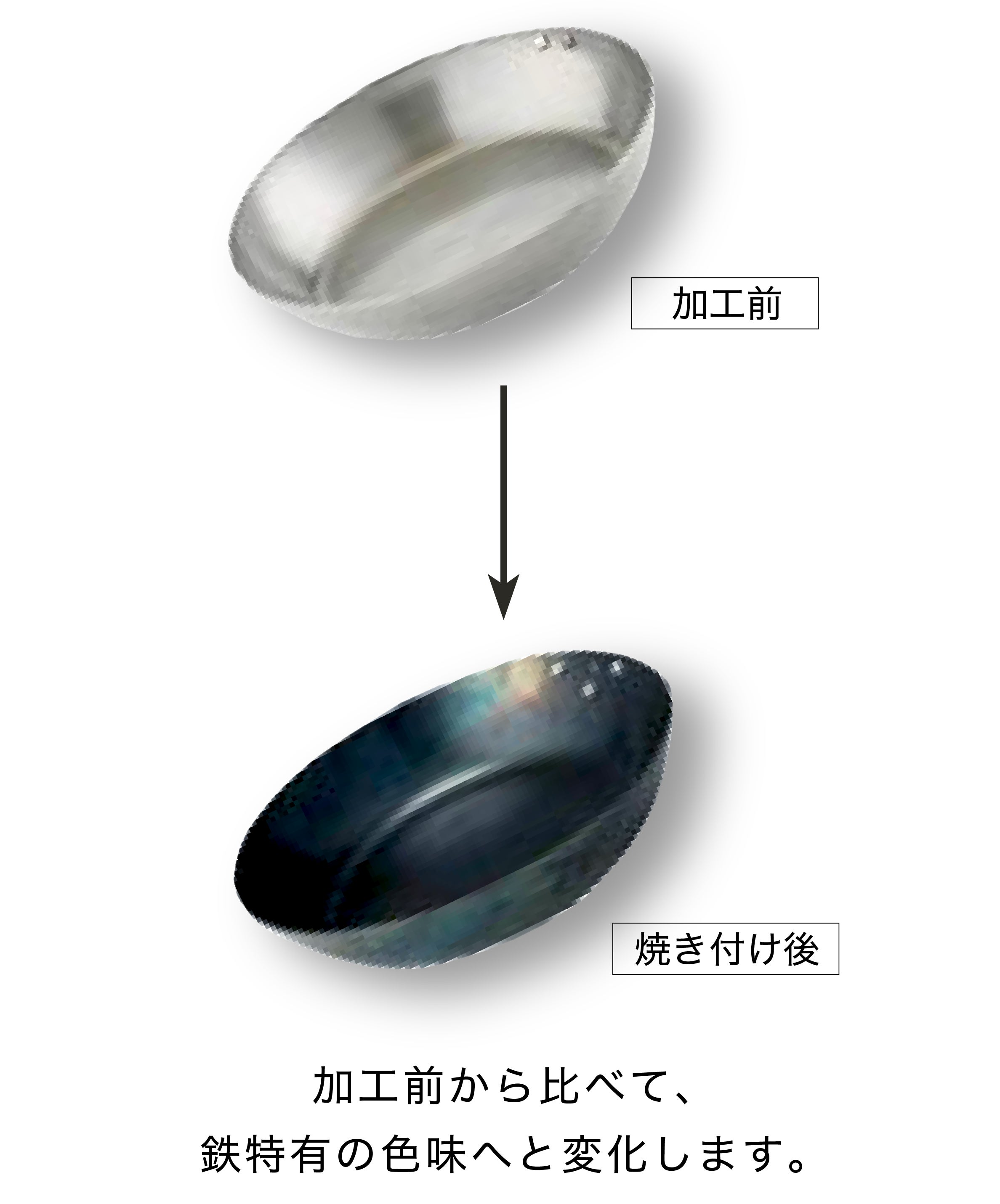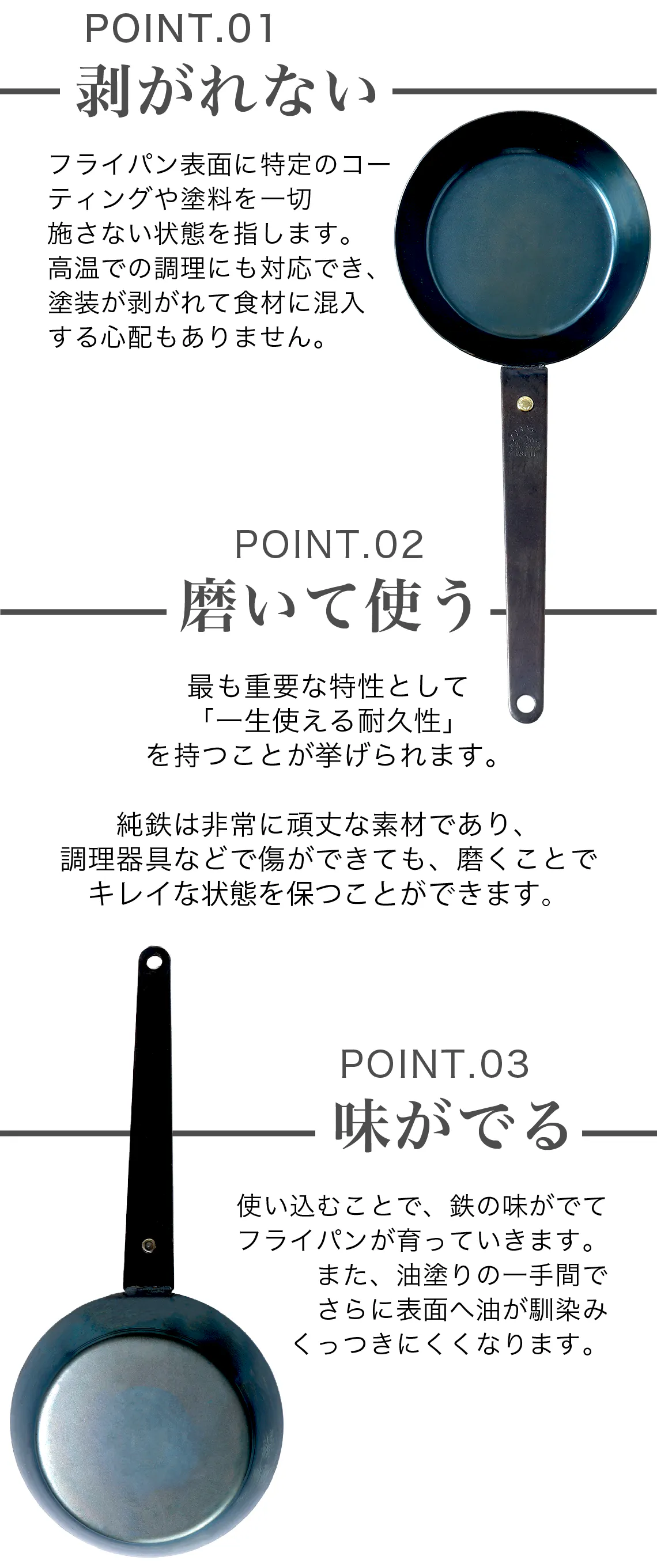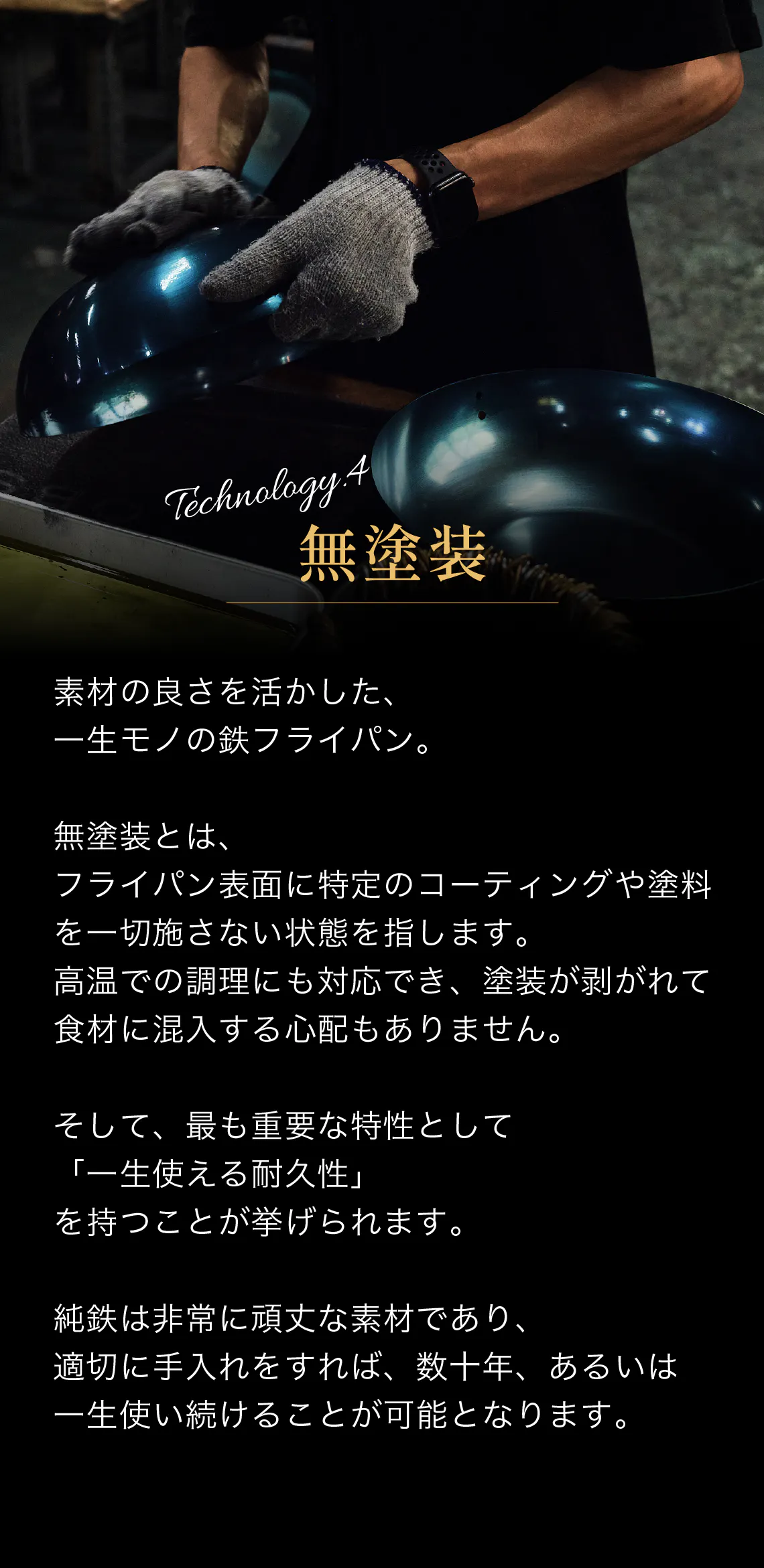 つまり、フライパンの表面はそのままの鉄の状態で、その素材の良さ、つまり鉄の強度と耐久性をそのまま活かしています。このため、鉄フライパン哲(TETSU)は長年使える相棒と言える長持ちするフライパンになります。