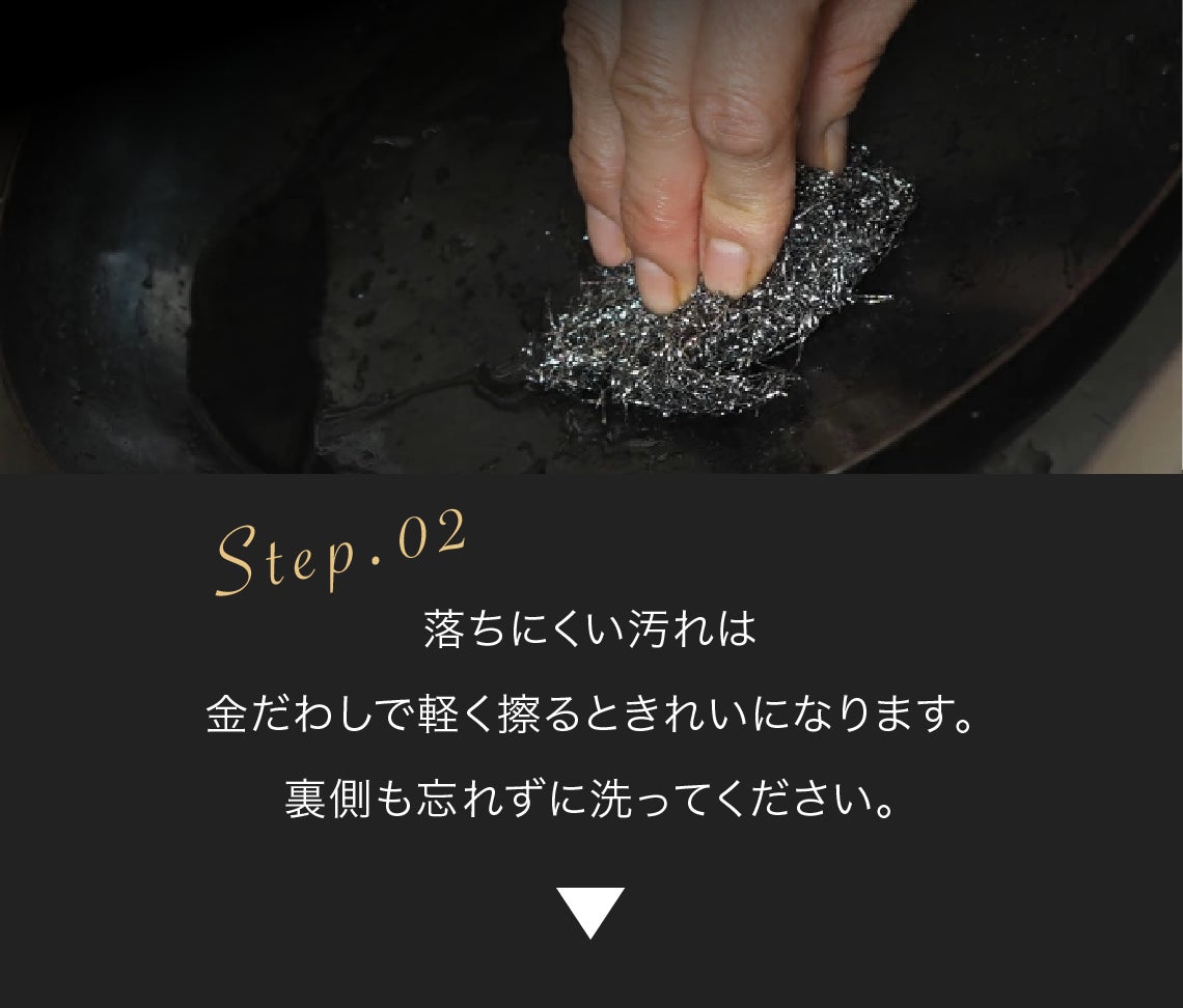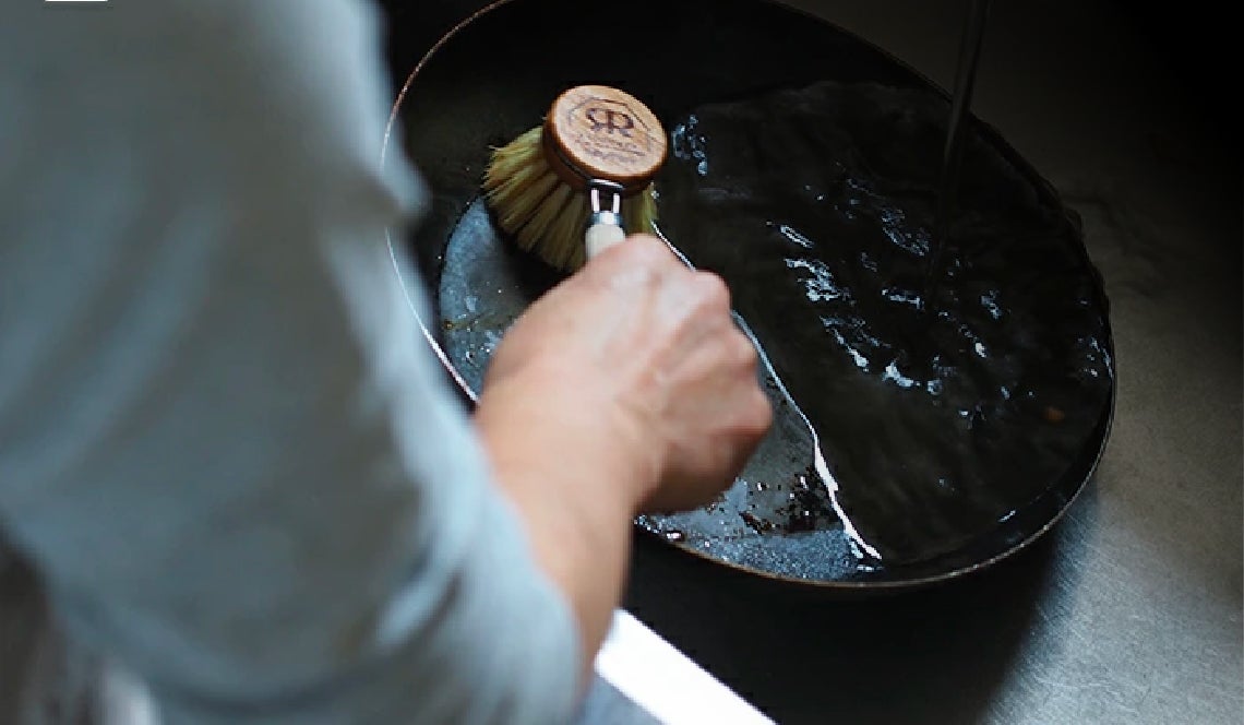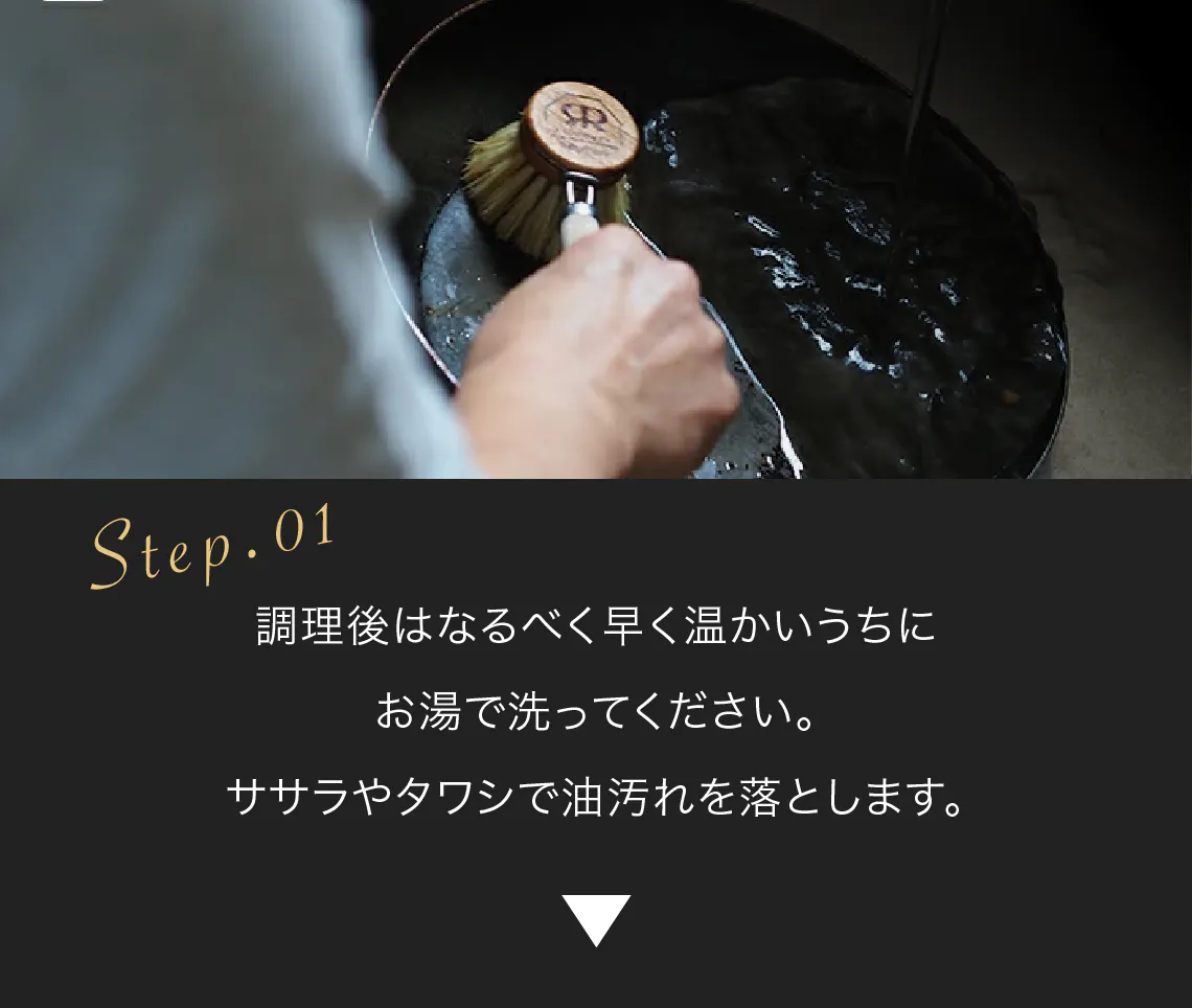 ▼熱いうちに汚れを落として、水で流すだけ。洗剤を使わず、水とタワシだけでさっと洗えるから、環境にも優しいです。