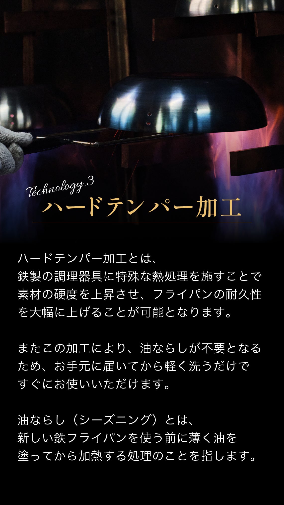 しかし、鉄フライパン哲(TETSU)は、ハードテンパー加工を施しています。工場でシーズニングを最大700度の火力で行ってから出荷するので、お手元に届いた瞬間からすぐに美味しい料理を作れます。
