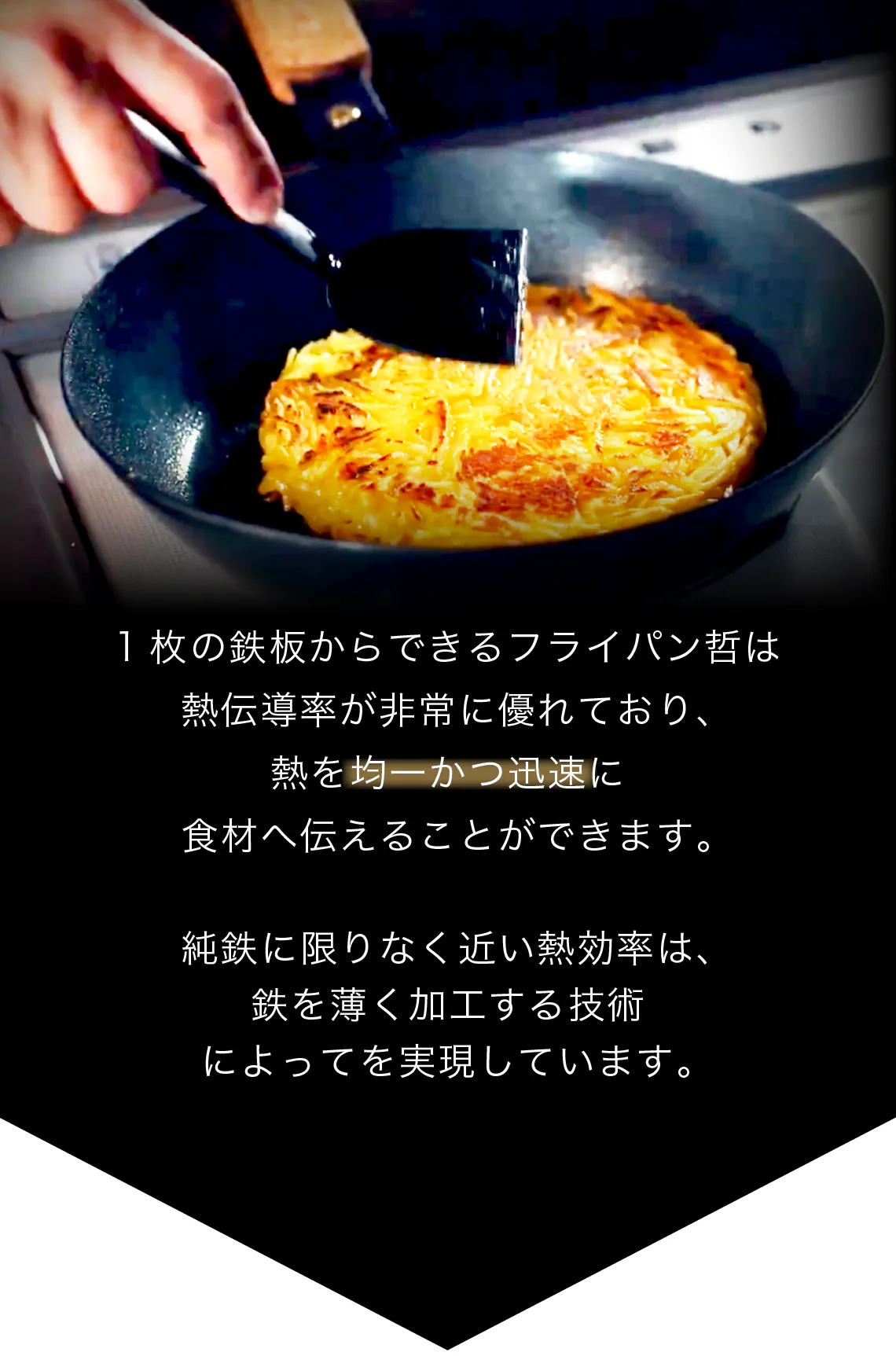 また、この迅速な熱伝導と鉄フライパン特有の蓄熱力により、食材が均一に加熱されます。