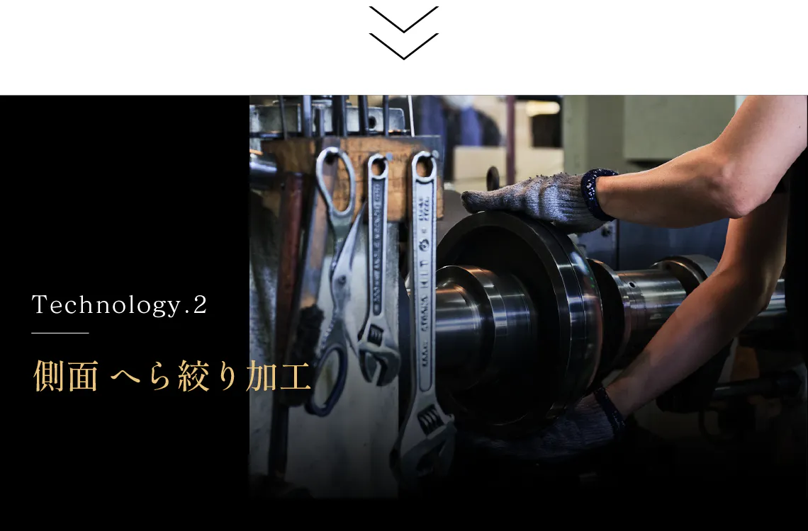 鍛冶工芸の一部であるこの加工法は、フライパンの側面を細く引き延ばすために使用されます。この繊細なプロセスにより、フライパンの厚みを均一に保ちつつ、全体的な重量を減らすことが可能となります。