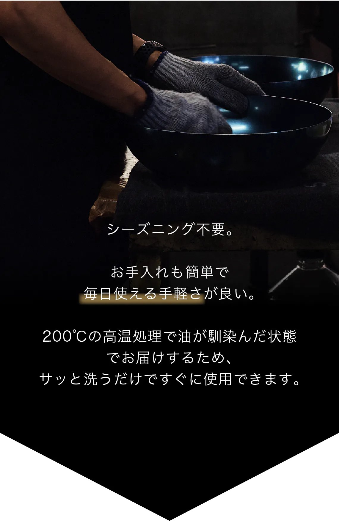 A: 哲(TETSU)と純哲(JUNTETSU)は、の表面はハードテンパー加工が施されているため、初回使用前にシーズニング(油焼き付け)を行う必要がありません。この加工により、手入れが容易で、新品時からすぐに料理に使用できます。