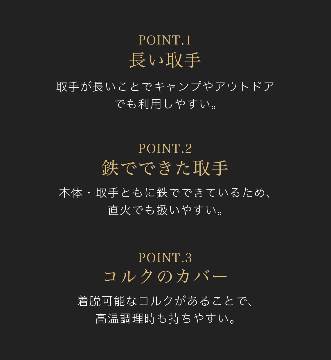ハンドルが長く、加熱中も熱くなりにくいため、直接火の当たらない部分は素手で握ることもできます。