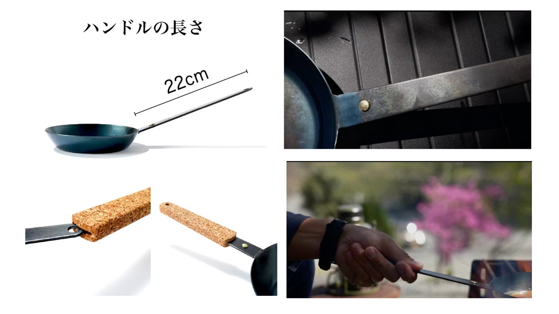 ハンドルが長く、加熱中も熱くなりにくいため、直接火の当たらない部分は素手で握ることもできます。