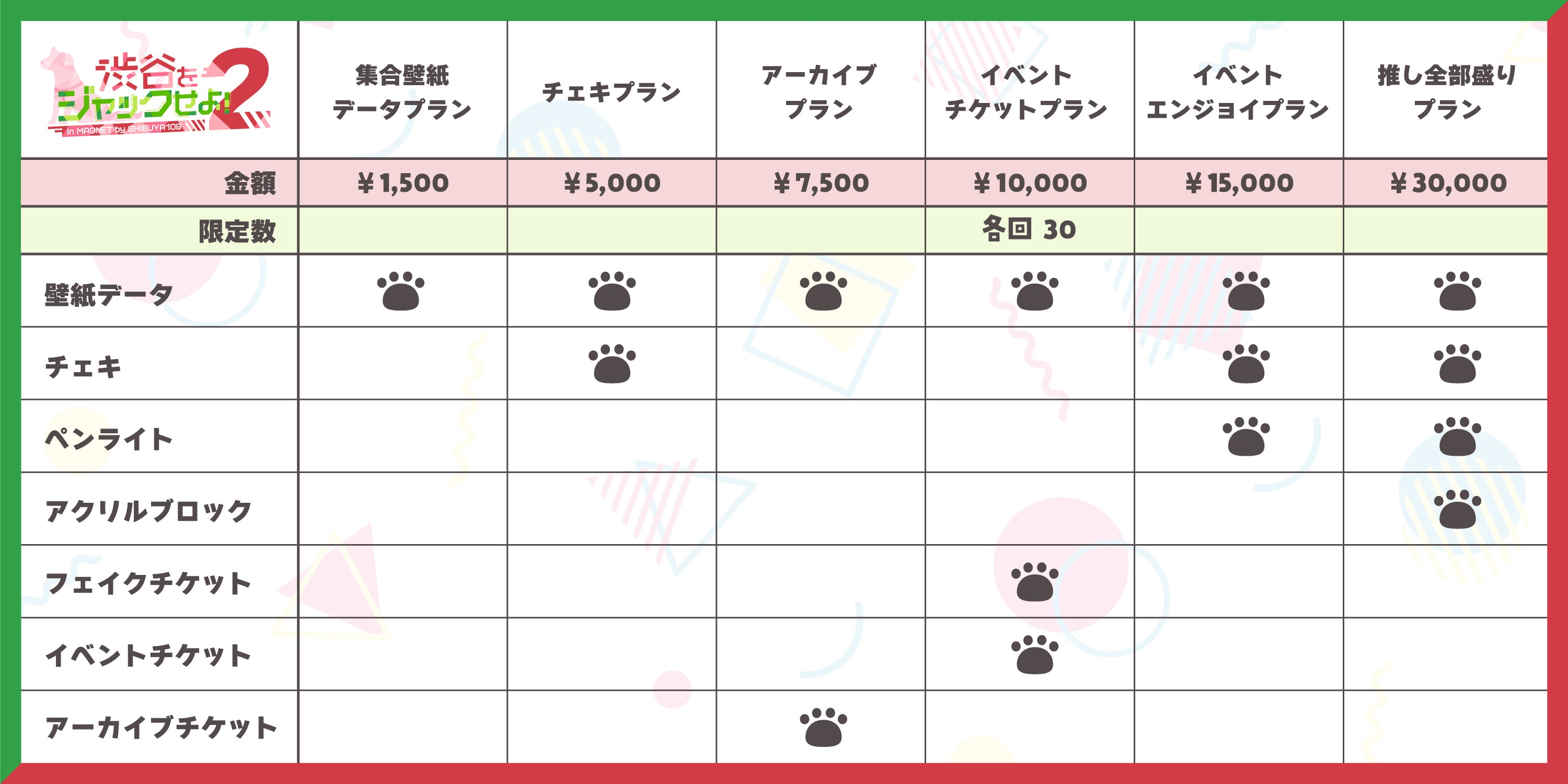 下記にて紹介する全てのプランにPOP-UP STORE内でランダムブロマイドや集合イラストのクリアファイルを販売できる権利が付属します。