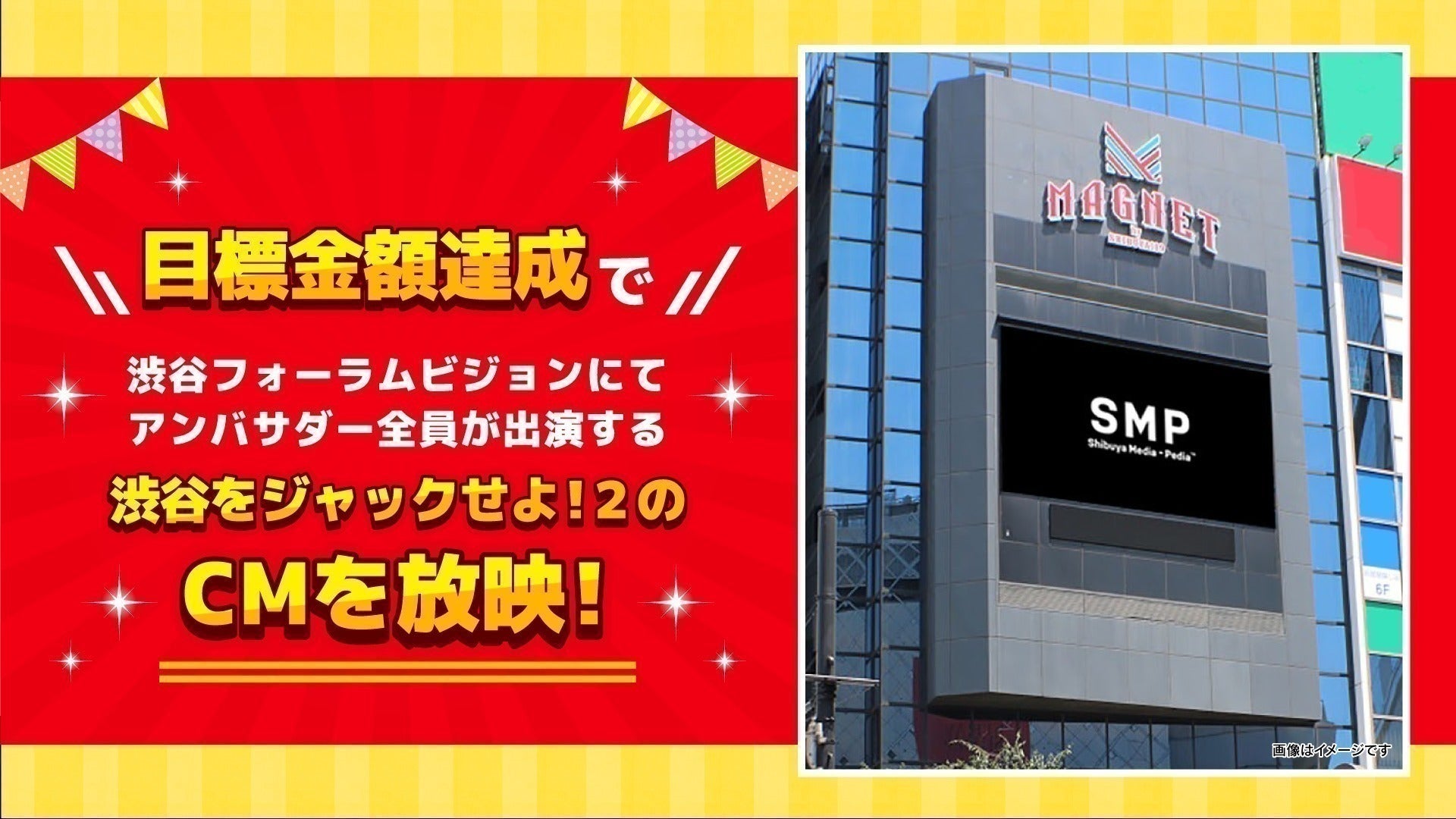 目標金額達成、ストレッチゴールの達成で施設内にてコラボ出来る範囲が増えていきます!まずは最初の目標金額である500万円達成でアンバサダー全員が出演する大型の109フォーラムビジョンにて本イベントのCMを放映!