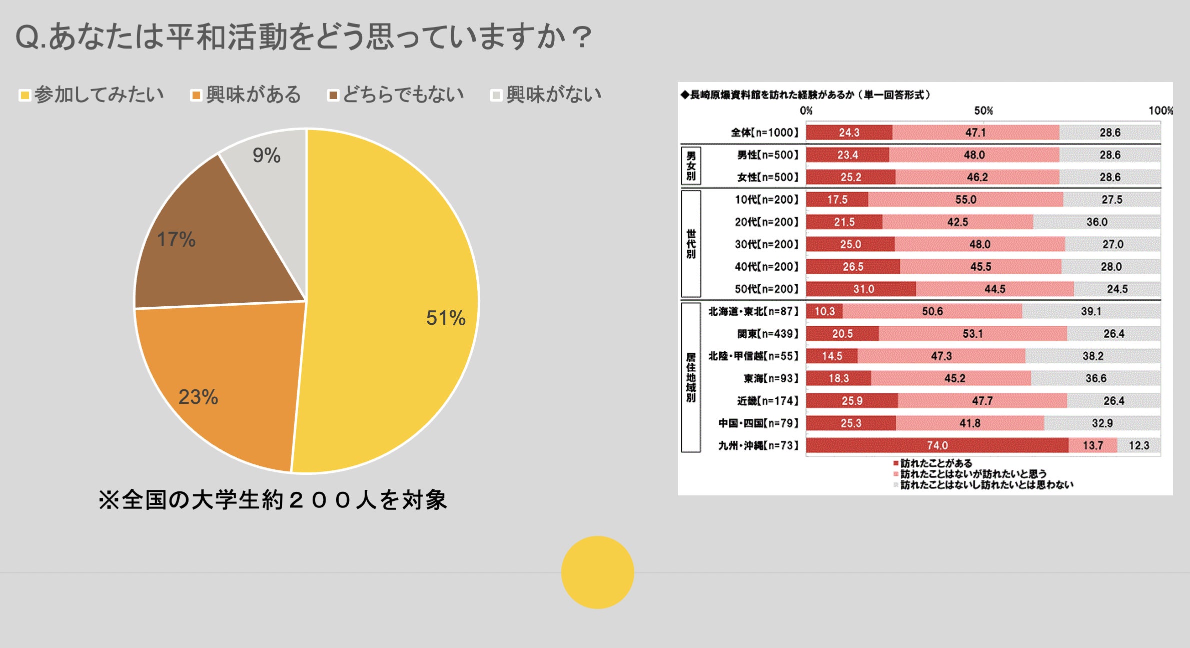 以外にも若者は興味を持っているが、資金的な問題で参加できていない。県外や国外からくる観光客も長崎の平和には興味を持っています。