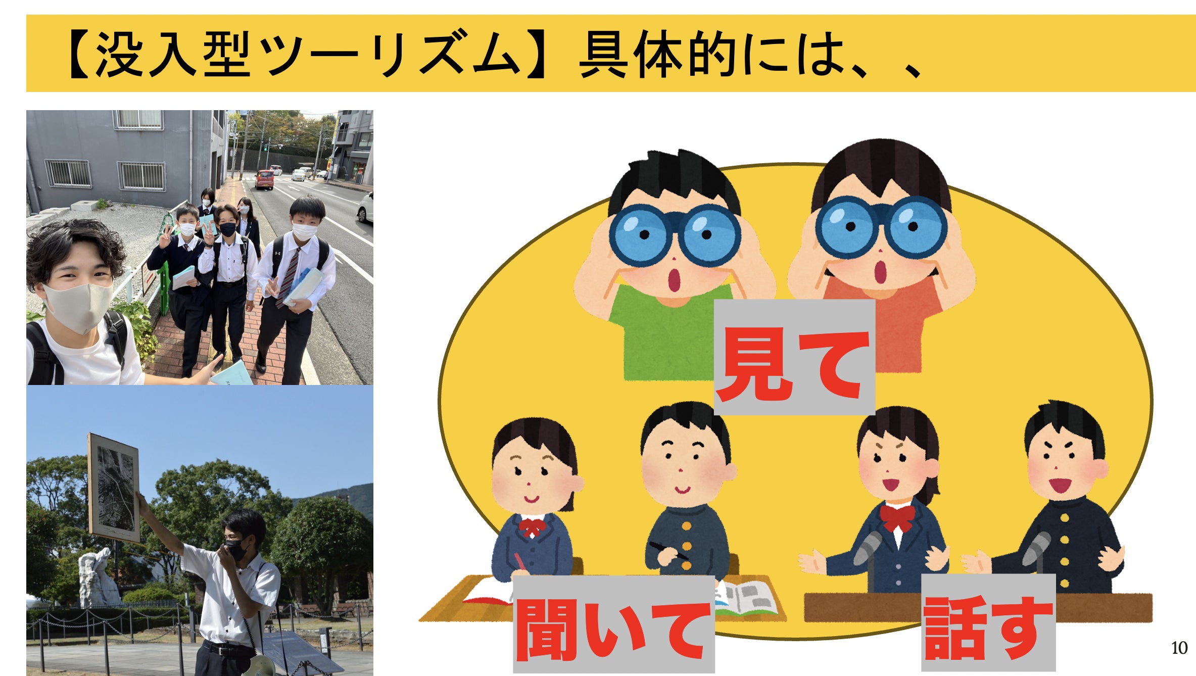 県内の学生、修学旅行生、観光客、インバウンドを対象にこれまでにはない平和教育の提供。見て(過去と今)聞いて(被爆体験談)話す(思いを伝える)学びの展開。今の長崎と被曝直後の長崎(写真や映像)を直接見て、被爆体験談を私たちが話して、話し合いながら学ぶというもの。県内の学校での出前授業を考えていますが、この事業は現在計画中であり、実施は3年目までを目標としています。